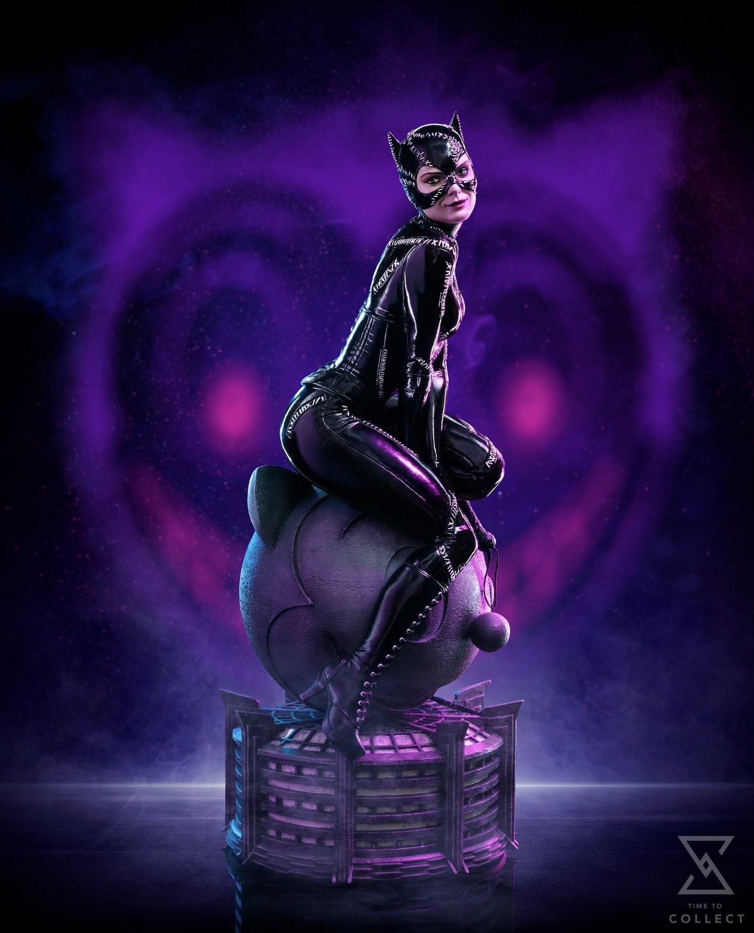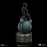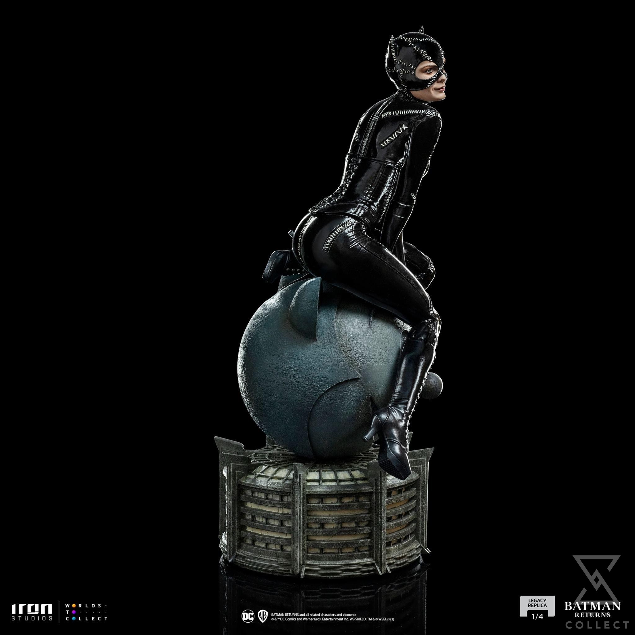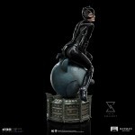 With a captivating smile, and a deep and seductive look, the mysterious and unpredictable villain comfortably sits over the statue in the shape of a cat’s head, a symbol, and a logo, on top of the building of Shreck’s department store, ironically the place where she transformed. Dressed in her memorable skintight black leather jumpsuit and holding her whip, a weapon she wields with impressive dexterity, she plans her vengeance against her former boss and torturer as a Christmas gift. Over a base reminding the roof of the largest shopping center in Gotham City, Iron Studios proudly present their statue “Catwoman – Batman Returns – Legacy Replica 1/4”, with the feline femme fatale most beloved by fans of Batman’s universe, in her portrayal in the classic film Batman Returns from 1992, directed by Tim Burton.