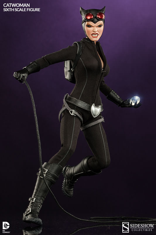 Gotham City’s resident cat burglar has arrived. Sideshow Collectibles is proud to introduce the elusive and alluring Catwoman. Fitted with a sleek black bodysuit and a few key tools of her trade, Selina Kyle is more than ready for her next heist. A helpful climbing harness will come in handy when making a quiet entrance or a hasty exit, and her trademark whip keeps the boys in line. A girl can’t leave home without the right accessories, so we’ve included a cat-shaped belt buckle, infrared goggles, burglary friendly boots and of course, this cat has claws! Two hand-painted portraits purr-fect our feline femme fatale, one with Selina’s mischievous smirk, the second shows off her more ferocious side. Gentlemen of Gotham City, keep a tight grip on your fortune and your heart.