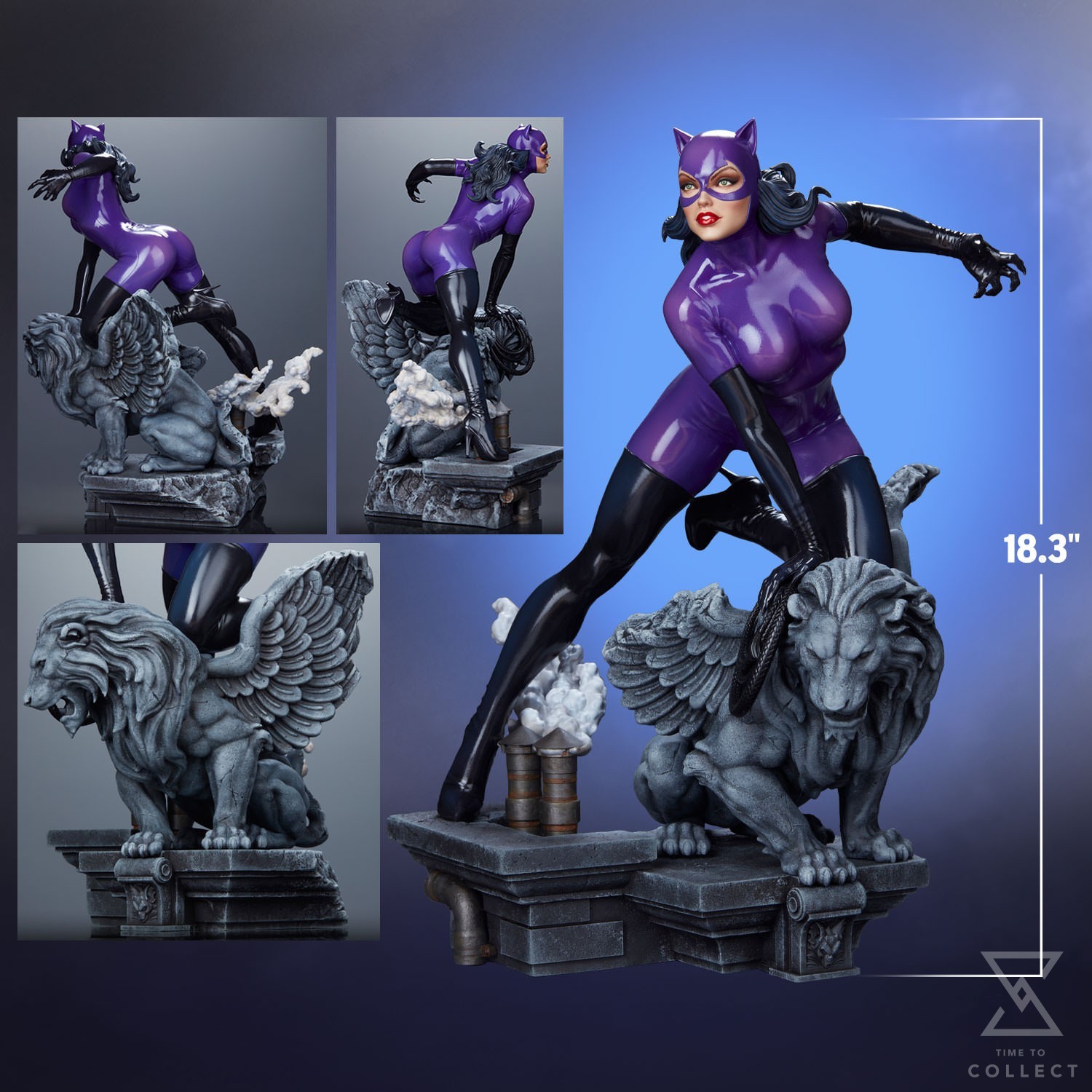 This fully sculpted polyresin statue comes with Catwoman in her throwback purple colorway, atop a lion-style rooftop ready to pounce! Dynamically posed with claws out and whip in hand, this Catwoman is ready to slink her way into your collection!