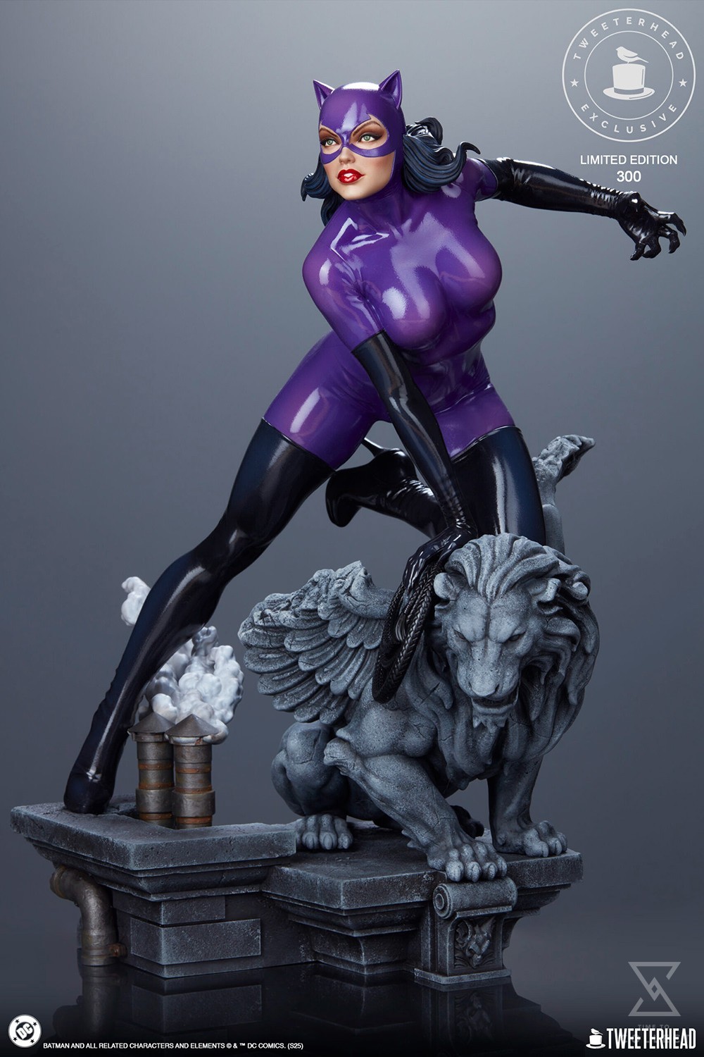 This fully sculpted polyresin statue has an edition size of 300 and comes with Catwoman in the beloved purple costume version of her costume, atop a lion-style rooftop ready for action! Dynamically posed with claws out and whip in hand, this Catwoman is eyeing her spot into your collection!