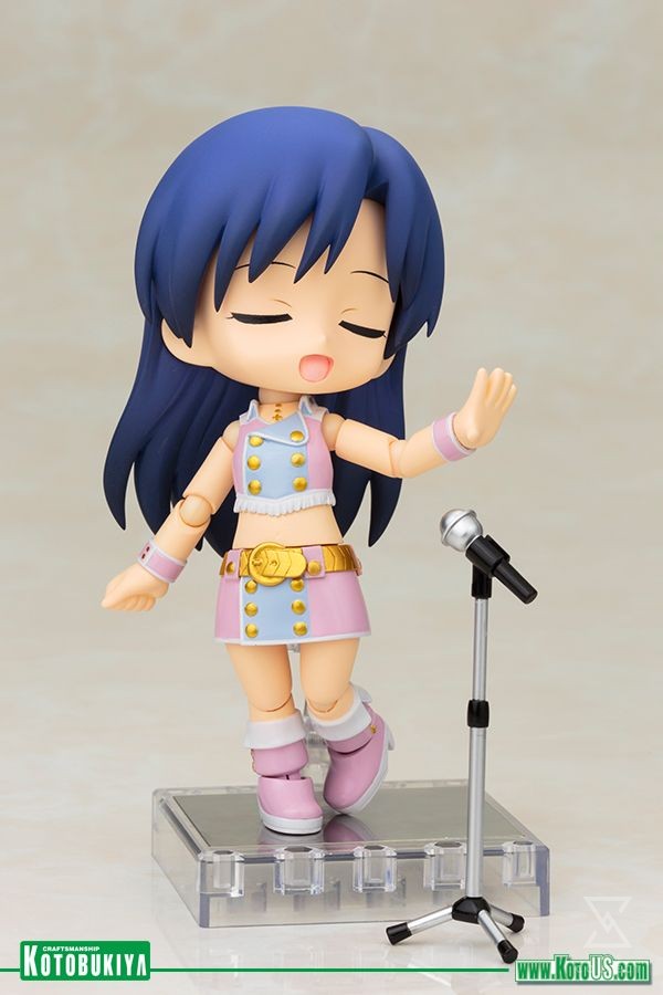 A Kotobukiya Japanese import! For the next member of the lineup of Cu-Poche figures we return to the Japanese hit video game and anime series The Idol M@ster (bringing the fast-paced and exciting world of managing pop idols to life) and introduce newcomer Chihaya Kisaragi! Poseable and fun, each Cu-Poche figure features multiple points of articulation and magnets in its feet for extra stability on the included base.The serious vocalist and competitor couldn’t be cuter in this miniaturized version wearing an adorable pink and blue sleeveless top with matching skirt, wristbands, and shoes. She ties the outfit together with gold accents including buttons, a thick belt, and necklace. As with all Cu-Poche figures Chihaya comes with lots of fun interchangeable parts and accessories like a microphone and stand, her personalized “out of office” board, multiple hands, and even different facial expressions capturing all of her silly moods! Kisaragi stands just under 4 ½ inches tall and has 15 points of articulation for great posing and display options. The look and proportions of the Cu-Poche line make for a fun and unique new style of collectible, and Chihaya is a great addition to the Idol M@ster lineup with her fellow singers Haruka Amami, Miki Hoshii, Yukiho Hagiwara, and Hibiki Ganaha!