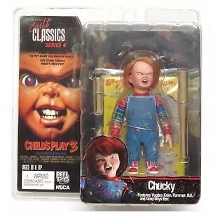 The first 7″ scale Chucky figure from NECA was based on the third film. By that time, Chucky was practically a household name, and a new staple in the horror genre. Chucky includes a few weapons, but no display base. Instead, they brilliantly included a “Good Guy Doll” display box, allowing fans to have their own miniature version of the sealed toy.