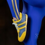 Measuring over 36” tall, Chun-Li stands ready for action, balanced gracefully on one foot, poised to deliver her fearsome hurricane kick. Decked out in her athletic Street Fighter Alpha look, this piece features impeccably tailored clothing including her blue leotard with gold stripes and an embroidered vest carrying over some design elements from her classic look. Her trademark ox-horns are uncovered here, made up of tightly wound braids and held up with gold ribbons. A pair of studded bracelets and a coordinated pair of athletic shoes complete the look.