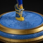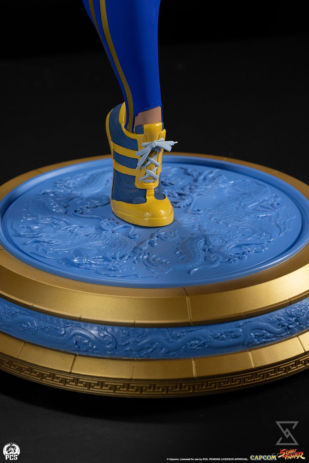 Chun-Li is posed on a low profile disc base decorated in her blue and gold color palette with sculpted details modeled after the embroidered belt she wore in her first appearance in Street Fighter II.