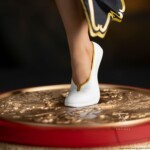 Measuring over 36” tall, Chun-Li stands ready for action, she is balanced gracefully on one foot, poised to deliver her fearsome hurricane kick. Wearing the elegant black dress of her alternate “Battle” look, this beautifully tailored garment is decorated with gold trim and hangs nearly to her feet. Her hair, usually pinned up in her trademark ox-horns, is worn down with a small braid over either ear. A pair of spiked white bracelets with a hammered gold belt fastened with an ornate knot and an understated pair of white ballet flats complete her evening-ready look.
