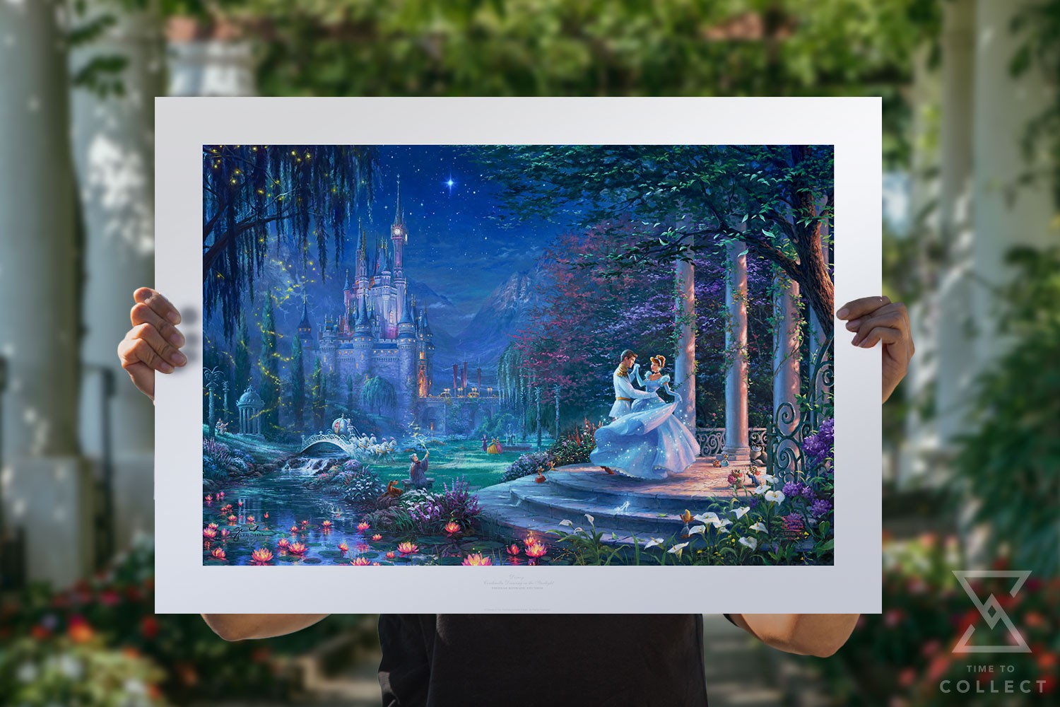The Cinderella Dancing in the Starlight unframed limited edition paper print presented by Thomas Kinkade Studios features premium heavyweight 100 lbs paper, long-life pigment inks that outperform conventional press inks, and an individually numbered certificate of authenticity matched to the art piece. For fans of Thomas Kinkade Paintings and Disney!