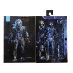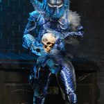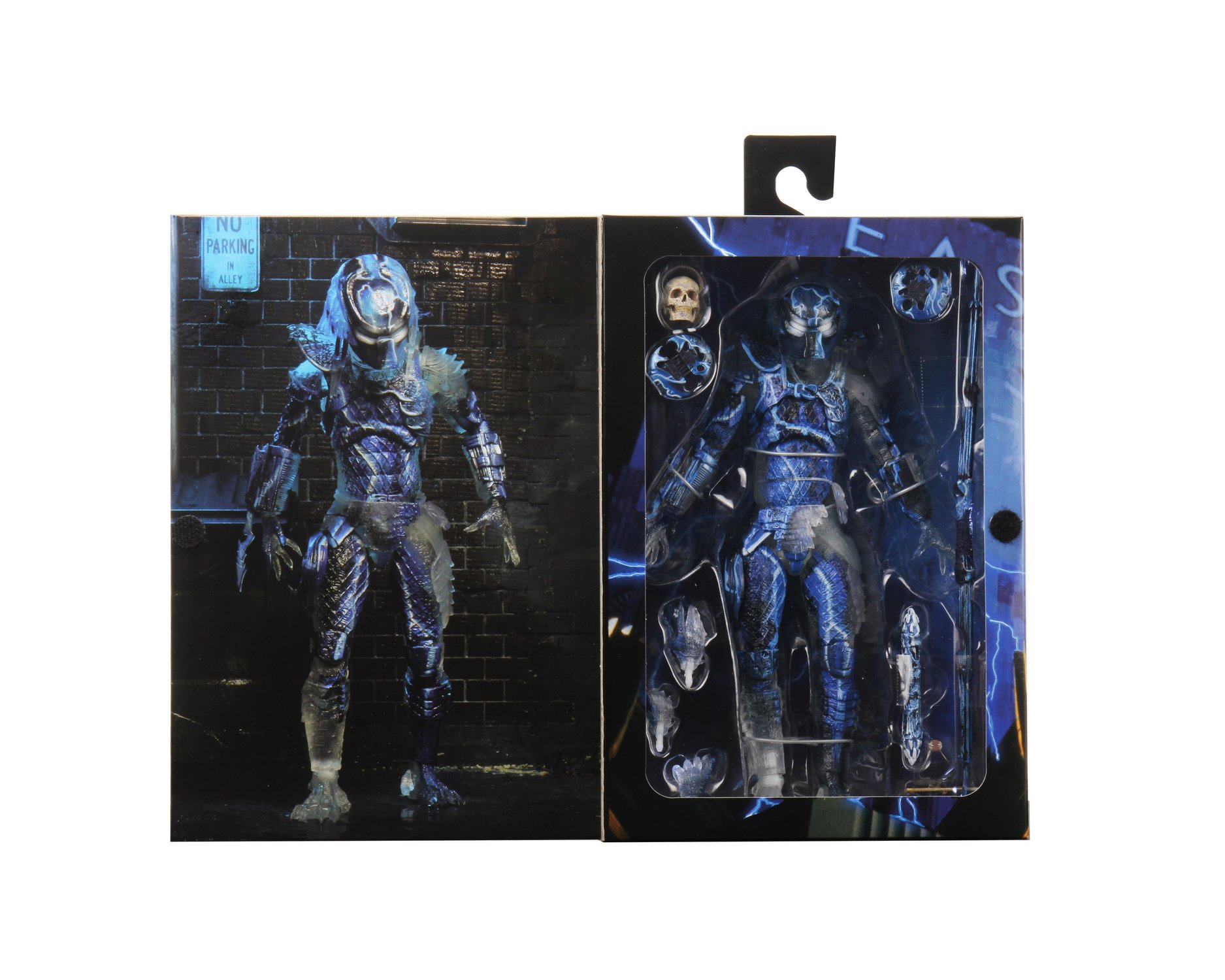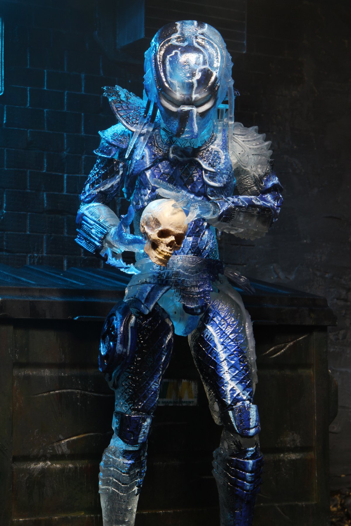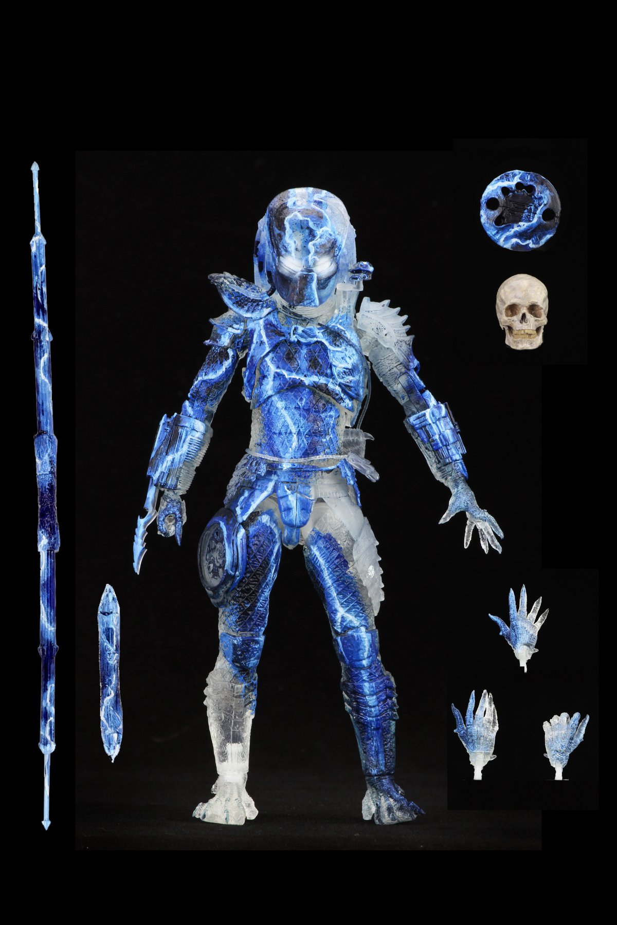 This stealthy Predator is cast in clear plastic with lightning accents to capture his appearance climbing the towering buildings in 1990 Los Angeles. The figure features over 30 points of articulation, retractable wrist blades and articulated shoulder cannon. It comes 5 interchangeable hands, discs, combi sticks, and a skull.