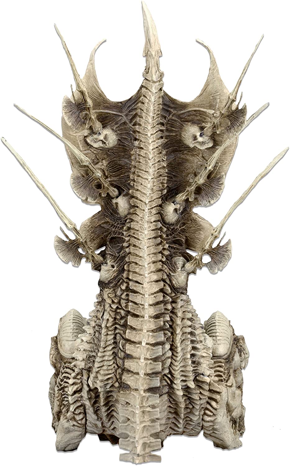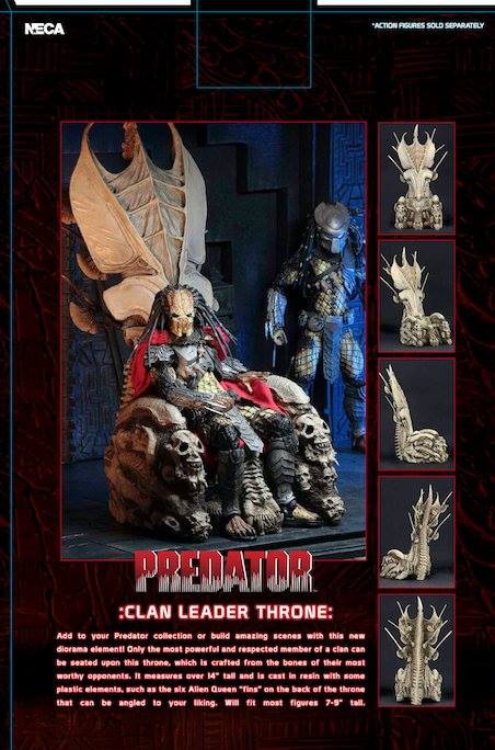 Add to your Predator collection or build amazing scenes with the new Bone Throne diorama element! Only the most powerful and respected member of a clan can be seated upon this throne, which is crafted from the bones of their most worthy opponents. The Bone Throne measures over 14” tall and is cast in resin with some plastic elements, such as the six Alien Queen “fins” on the back of the throne that can be angled to your liking. Sized to fit NECA’s 7” scale line of Predator action figures (will fit most figures 7-9” tall). Closed box packaging.