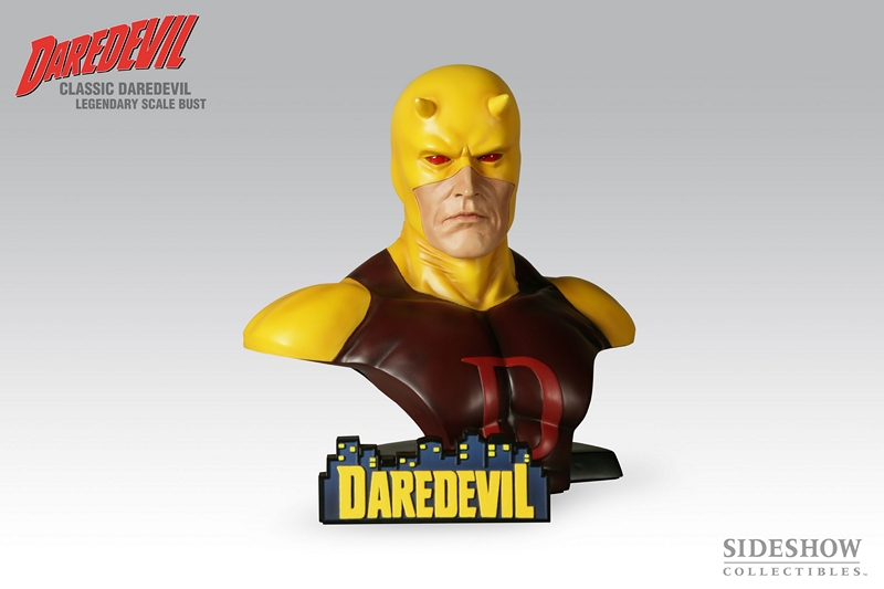 Straight from the rooftops and alleyways of Hell’s Kitchen, Sideshow Collectibles and Marvel Comics proudly present the latest addition to the Marvel Legendary Scale Bust series, “Daredevil- The Man Without Fear.” Based on the Marvel super-hero character created in 1964 by Stan “The Man” Lee and Bill Everett, ol’ horn-head is captured in approximately 1:2 scale and adorned in his classic yellow and brown costume. Meeting the standard of excellence that is the hallmark of a Sideshow sculpture, you don’t have to have heightened senses to appreciate the life-like quality and expertly crafted details. Hand finished and hand painted in high-quality polystone, the Classic Daredevil Legendary Scale bust is a perfect addition to your collection hall of Marvel heroes.