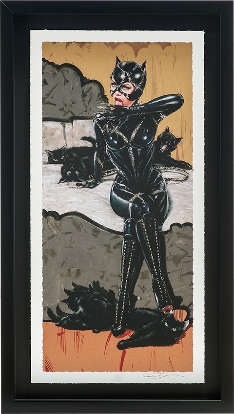 Clawsplay captures Michelle Pfeiffer’s sultry and sensational performance as the feline femme fatale Catwoman in Tim Burton’s Batman Returns. Wearing her iconic stitched catsuit, Selina Kyle gives herself a quick cleaning after a busy day of getting the better of Batman, enticing the viewer with her antagonistic allure. She is surrounded by a gathering of black cats, each with its own distinct character as these fine felines recline on a luxurious bed.
