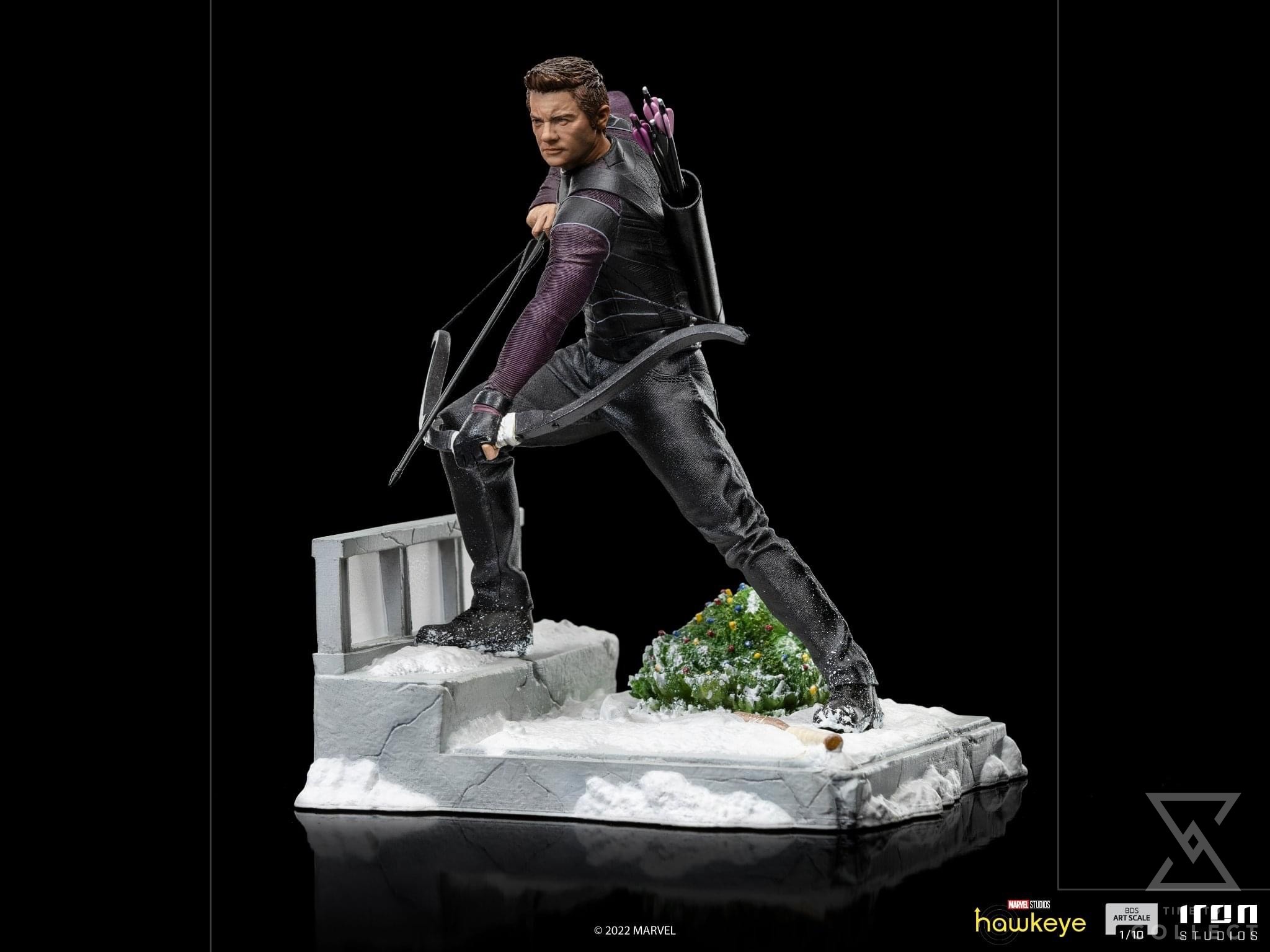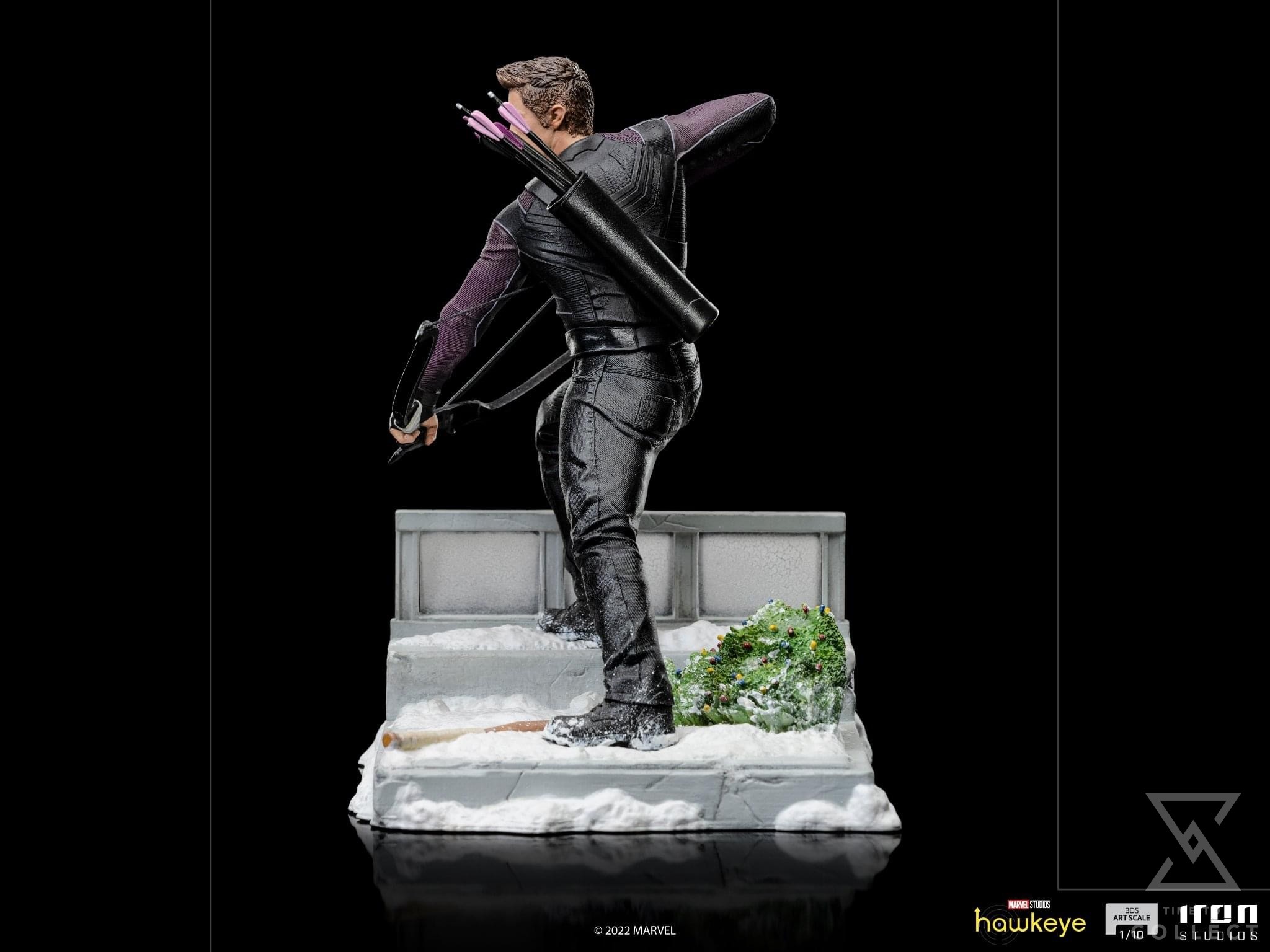 On Christmas Eve, after landing abruptly and unexpectedly from the top of a big Christmas tree, the veteran Avenger master in archery gets ready next to his young partner, with his bow ready with special arrows, he assumes position prepared to face a horde of bandits that surround them. Over a pedestal referring to the cold floor covered in ice of the Central Plaza, part of the Rockefeller Center complex in New York, next to decorated branches from the newly fallen tree, Iron Studios bring the statue “Clint Barton BDS – Hawkeye Series – Art Scale 1/10”, inspired by the episode “So This Is Christmas?”, sixth and last episode of the Hawkeye miniseries created for Disney+.