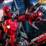 Crafted based on the reimagined appearance of Deadpool in armored suit, the highly-detailed figure features a newly crafted helmet head with LED-light up function; intricate design of a heavily advanced suit painted in signature red and black with matte finishing and dark silver highlights; LED light-up function design on eyes, Arc Reactor, and hands; a selection of signature weapons including a pair of Katanas, pistols that can be combined and transformed into a heavy machine gun, saias, dagger, and shurikens; multiple pairs of interchangeable hands; and a figure stand for display.