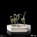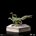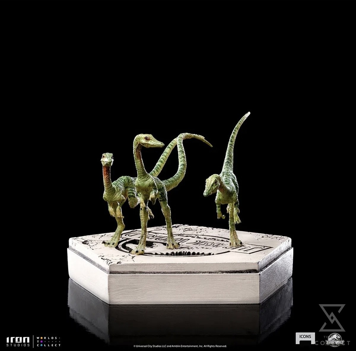 One of the smallest dinosaurs ever found the Compsognathus lived in the Europe region at the end of the Jurassic period. Introduced in “Jurassic Park 2: Lost World”, where a pack attacked the girl Cathy Bowman that was feeding one of the small dinosaurs, happily she survived the attack. Later another pack attacked the hunter Dieter Stark when he got lost in the forest of Isla Sorna, and unfortunately, the hunter didn’t survive. It was revealed in “Jurassic World: Fallen Kingdom” that a population of Compsognathus survived Isla Nublar, and in “Jurassic World: Dominion”, the Department of Prehistoric Wildlife confirmed a sighting of Compsognathus in Brazil eating garbage, besides their presence in the U.S. and Europe. Iron Studios proudly present their new statue “Compsognathus Jurassic World – Icons”.