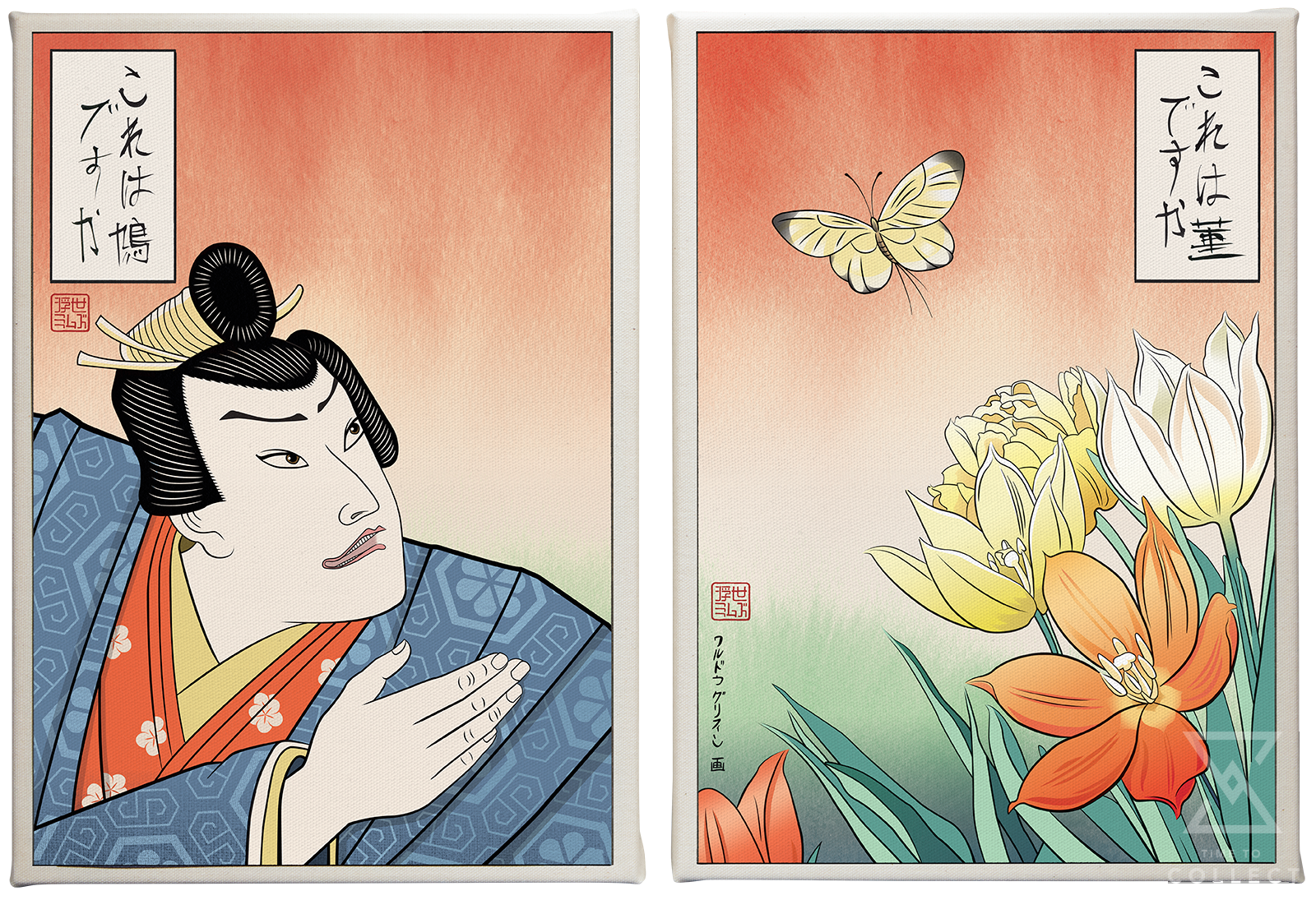 Sideshow Art Prints presents the Confused Anime Butterfly Guy Canvas Art Print (Set of 2) by artist ukiyomemes, blending Japanese art history with modern meme culture to create a high-end and humorous addition to any art collection.