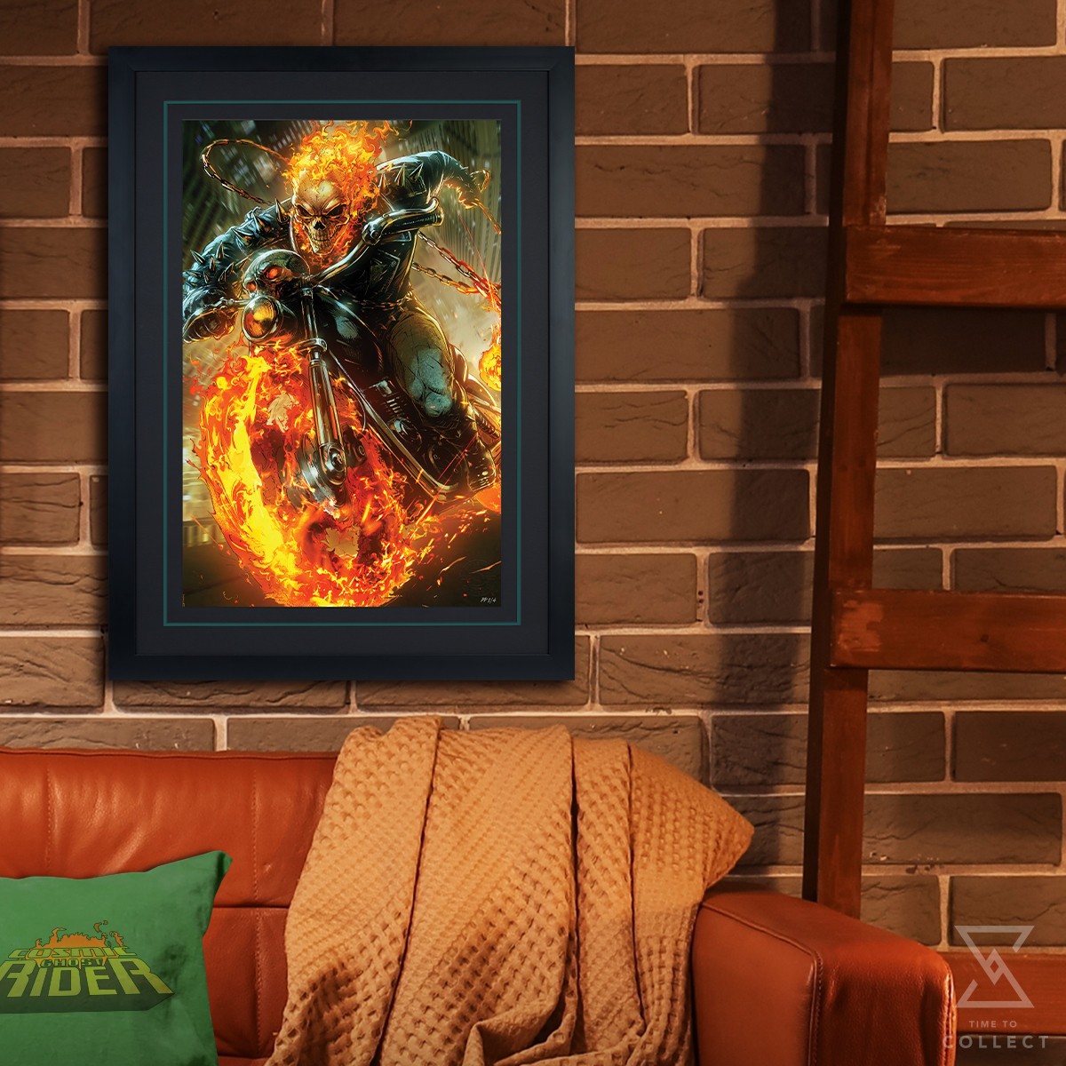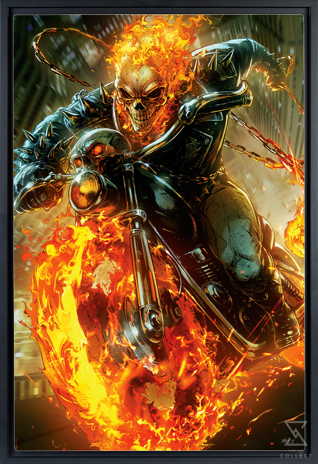 Originally created as a variant cover for Cosmic Ghost Rider #4 (2018), written by Donny Cates for Marvel Comics, this Ghost Rider collectible is now available to fans as an unframed giclée print or in a custom framed presentation. Each Cosmic Ghost Rider Fine Art Print features an embossed Sideshow Seal of Authenticity as part of the limited edition of 150 pieces.