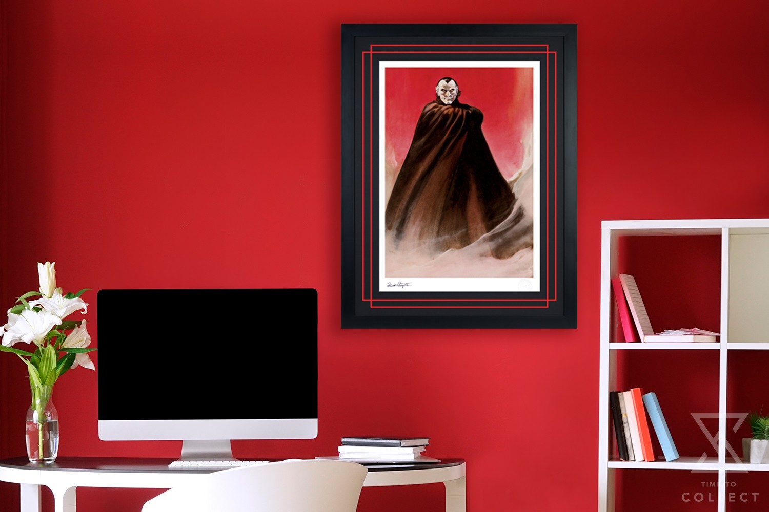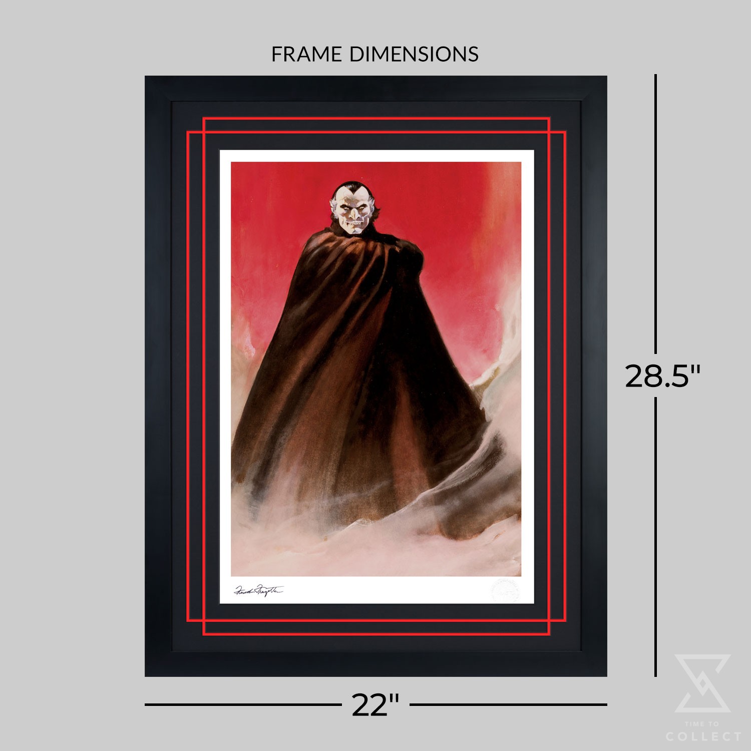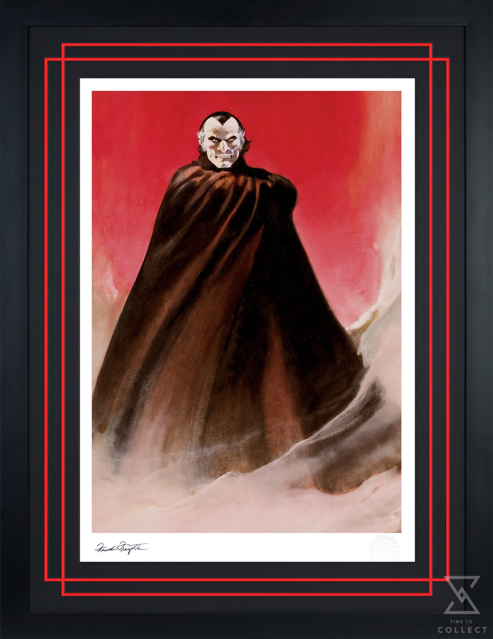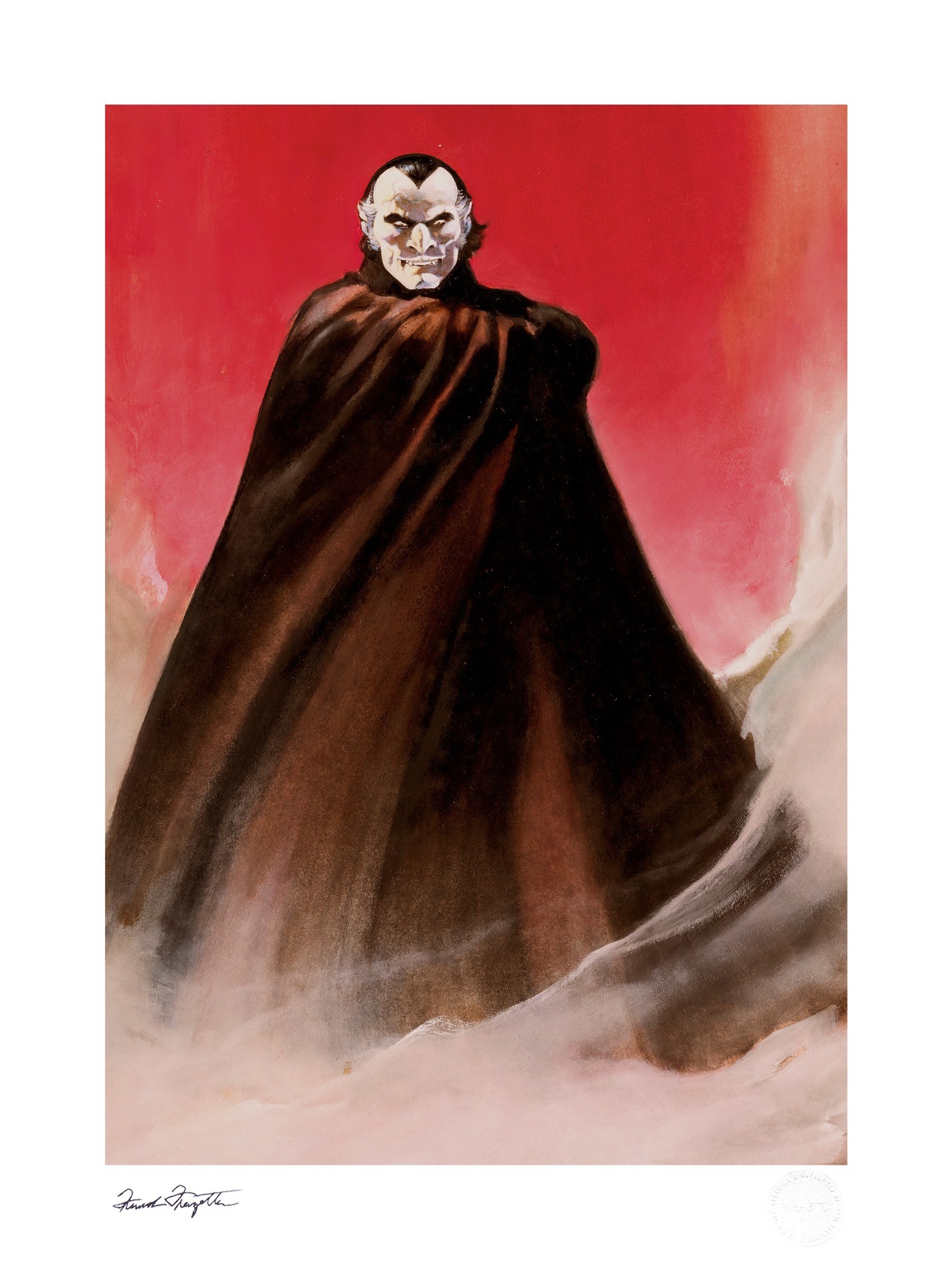 Each Count Dracula Fine Art Print includes a Certificate of Authenticity and features a hand-stamped, authorized signature of artist Frank Frazetta as well as the official Frazetta Art Museum embossed Seal of Authenticity as part of the limited edition of 150 pieces. A portion of the proceeds from sales of this Count Dracula print will benefit the Frazetta Art Museum’s preservation and exhibition of the artist’s essential works. Available as an unframed giclée or in a custom black framed format, this horror artwork makes a chilling addition to any fan’s collection.