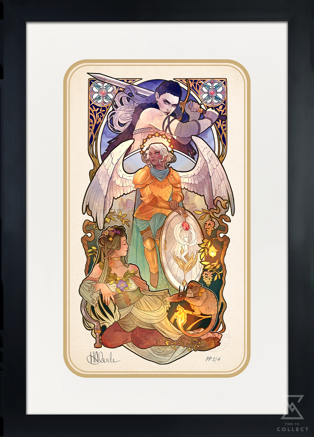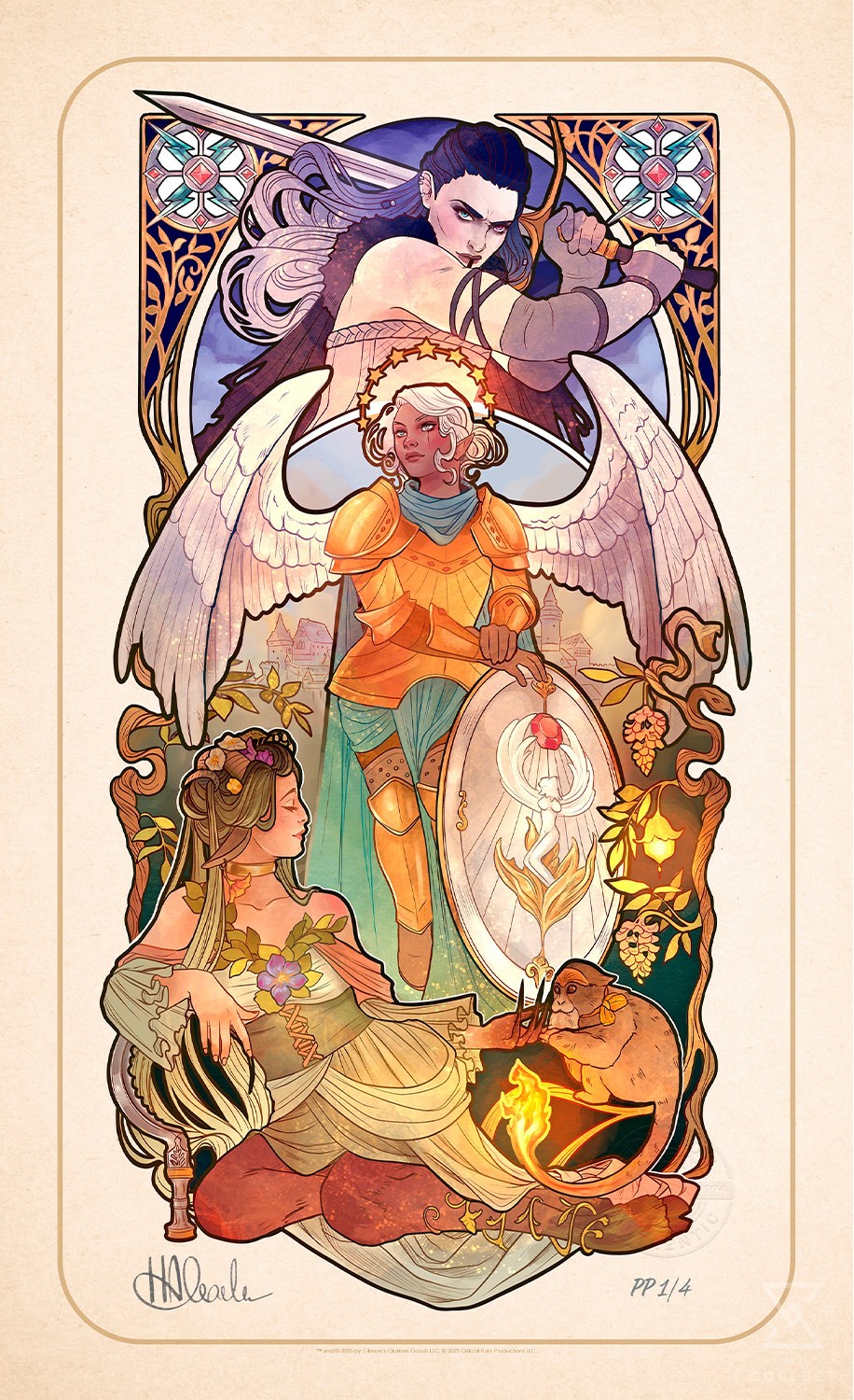 Three characters, each varied in personality, abilities, and history, stand connected by one player and the threads of fate woven across Exandria. At the top of the print, zealous warrior Yasha Nydoorin readies her sword for the oncoming storm. In the center, the Everlight’s faithful healer Pike Trickfoot embodies the goodness of her goddess, prepared to shield those in need of aid. Below, the puckish and playful Fearne Calloway sits with her fiery familiar Little Mister, enjoying the splendor of the wilds. This intricate composition features incredible details from throughout Ashley Johnson’s time at the Critical Role table, giving fans a chance to relive the excitement and action of 10 years of storytelling.