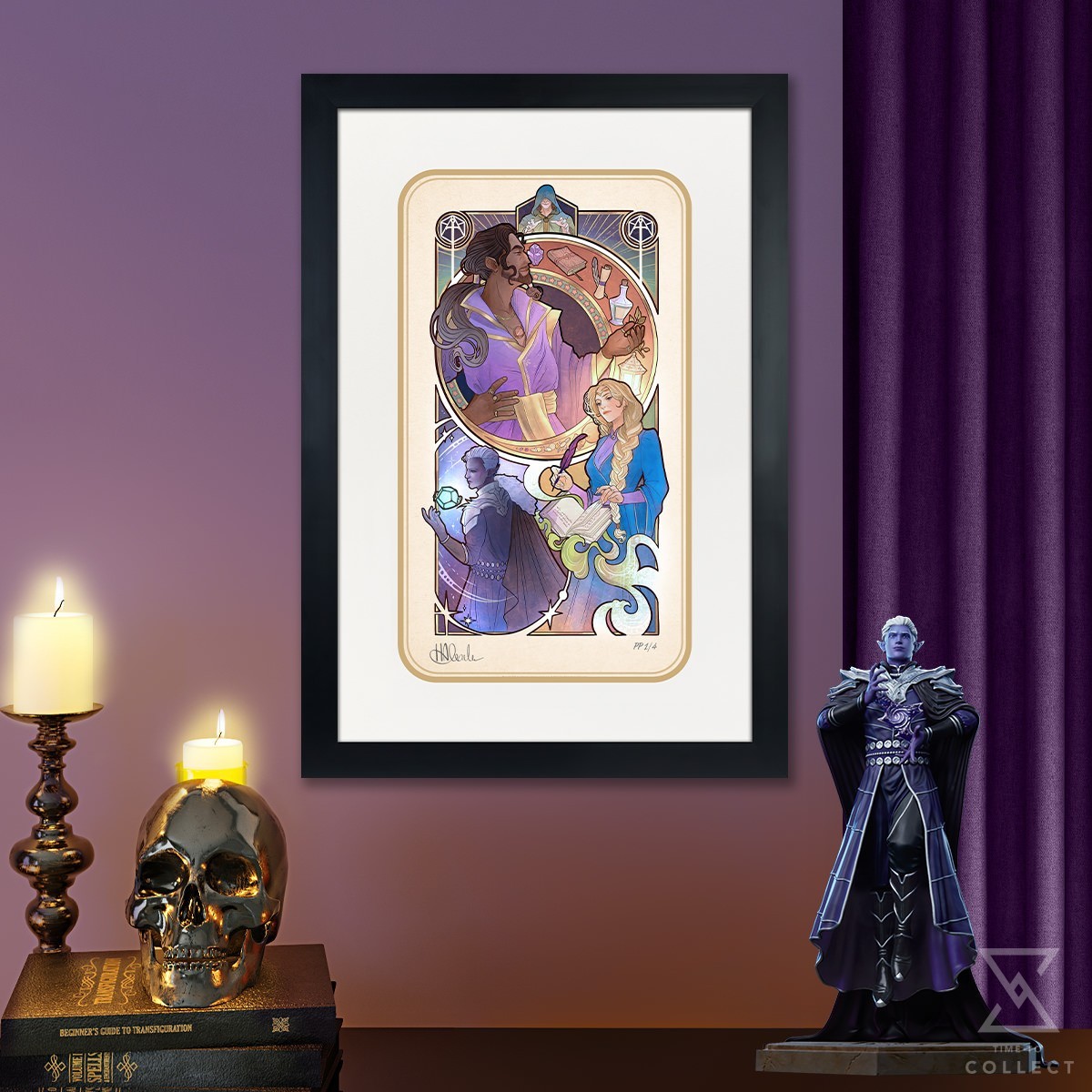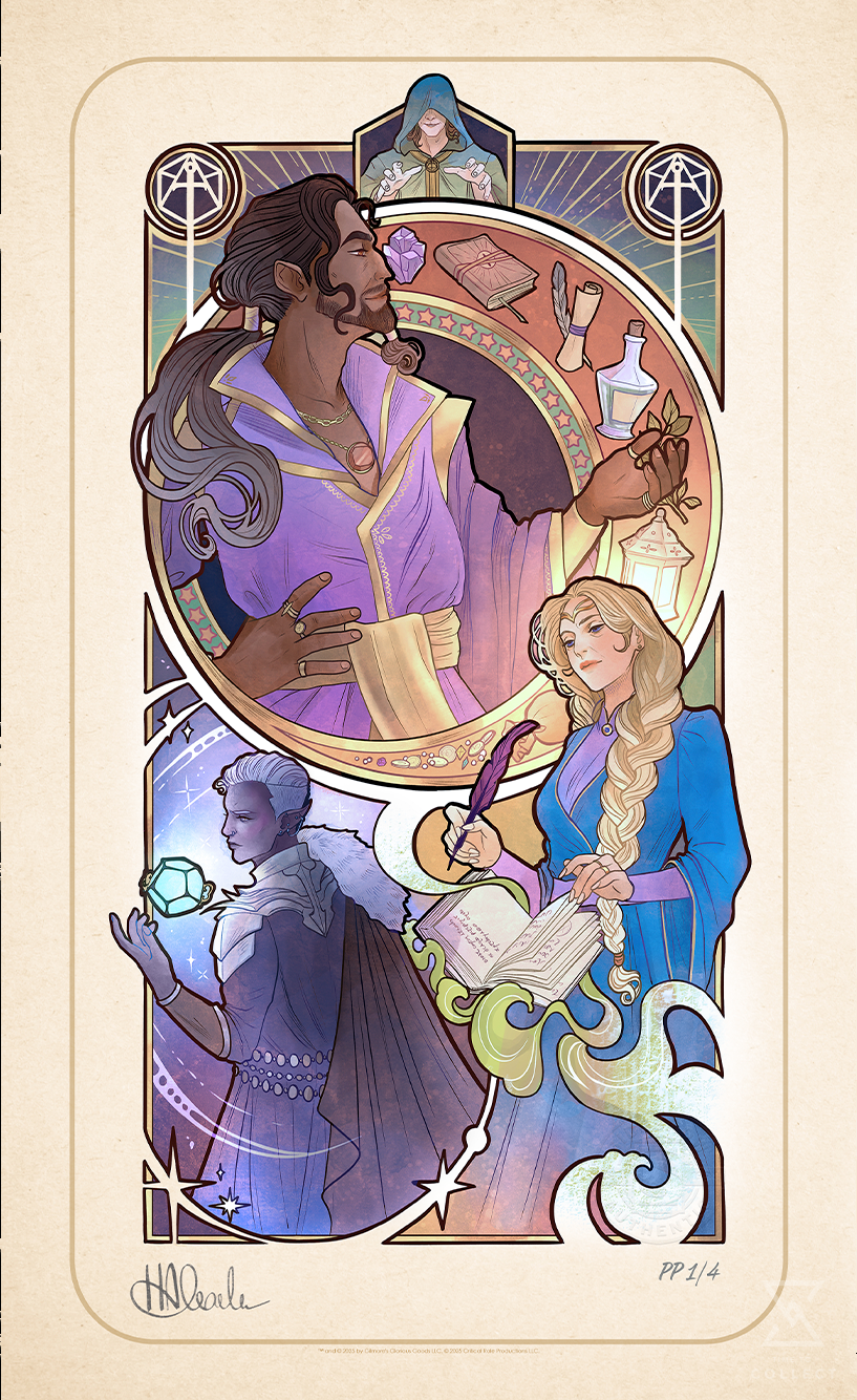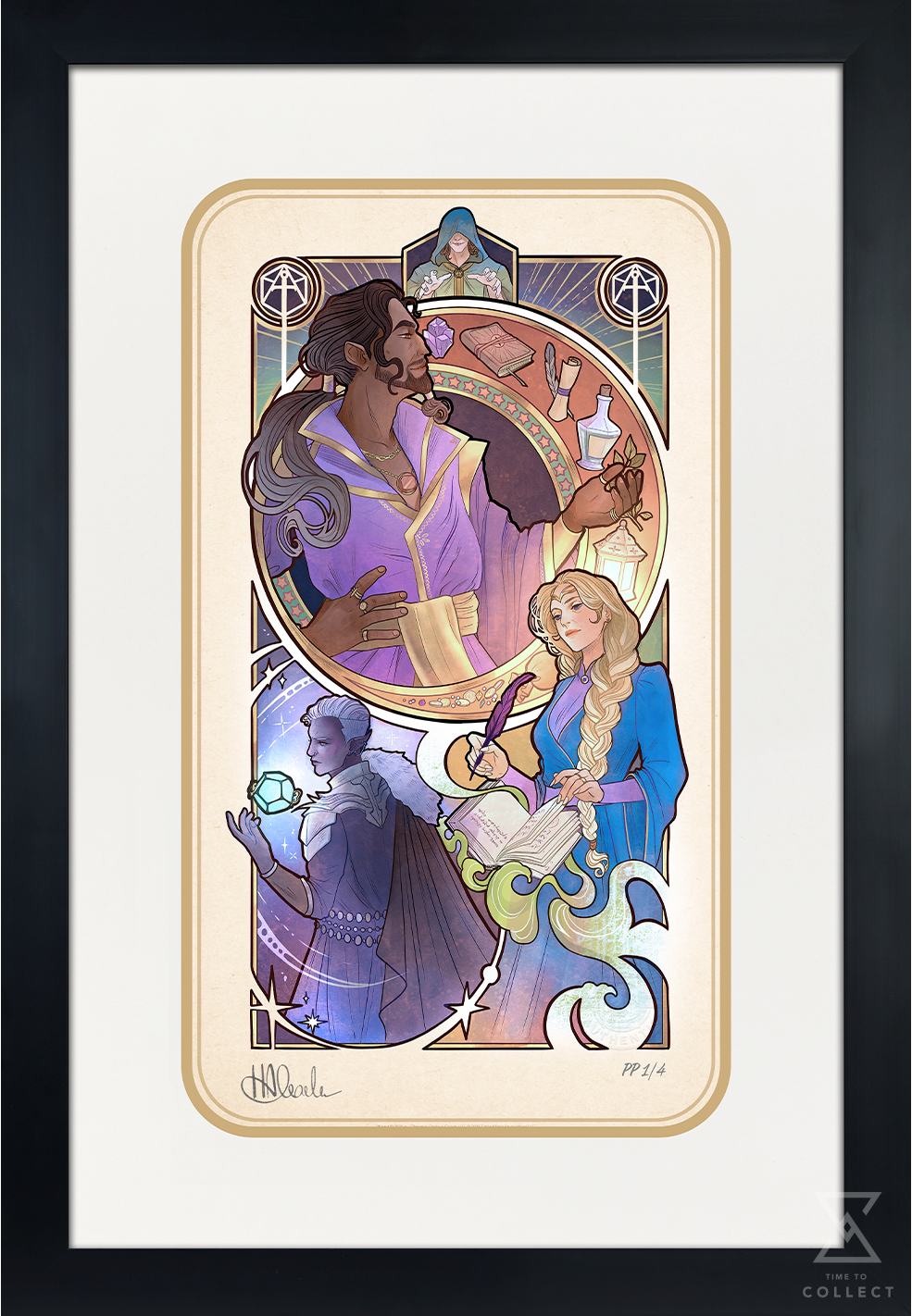 As the game master, Matthew Mercer gives voice to countless characters across Exandria, both friend and foe to the heroes of each campaign. Three particular arcane allies, each varied in personality, abilities, and history, have endeared themselves to the players and fans alike, celebrated here. The ostentatious Shaun Gilmore, purveyor of glorious goods, supplies adventurers with essential magical items. Sagacious and kind, Allura Vysoren serves on the Tal’Dorei Council and gives guidance as a former adventurer herself. And the reformed and elusive Essek Thelyss uses dunamancy to manipulate chance and fate itself to aid the greater good. This intricate composition features incredible details from throughout Matthew Mercer’s time at the Critical Role table, giving fans a chance to relive the excitement and action of 10 years of storytelling.
