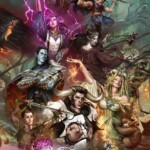 In the center of the composition is the team that started it all, Vox Machina: Grog Strongjaw, Keyleth of the Air Ashari, Percival de Rolo III, Pike Trickfoot, Scanlan Shorthalt, Taryon Darrington (and Doty), Vax’ildan, and Vex’ahlia (and Trinket). They are joined by allies Allura Vysoren and Shaun Gilmore.