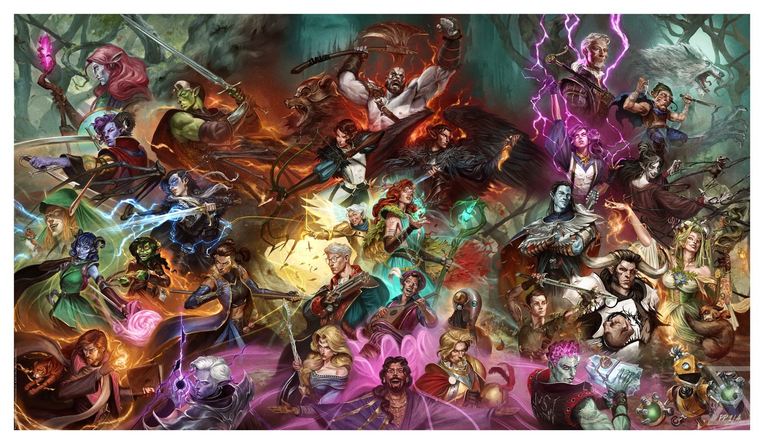 Celebrate three epic campaigns with this action-packed triptych of Vox Machina, the Mighty Nein, and Bells Hells! Across continents and generations, our heroes are connected by the invisible threads of fate and a shared desire to stand together in the face of evil. With weapons drawn and spells readied, these vibrant, beloved adventurers are united by what makes them different, ready to face any challenge. The full illustration encapsulates 10 years of adventure, featuring 35 characters (and animal companions) in total.