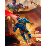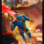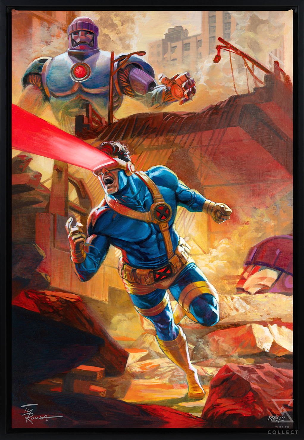Follow his lead! Cyclops charges into battle against the mutant-killing machines known as Sentinels in this epic illustration. Unrelenting in his pursuit of a better future for his people, Scott Summers runs through the ruins of a city. His war-torn world burns in shades of orange, yellow, and a red as bright as the beams shooting from his eyes, while his striking blue costume becomes a beacon of hope for his fellow mutants.