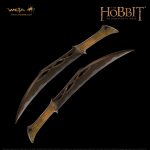 Slender and keen edged were the knives of Tauriel of the Woodland Realm, fitting arms for a lady warrior of equal keenness and skill. Tauriel’s golden-hued blades were wrought in the cavern smithies of her people, the Sindar, deep beneath the once beautiful Greenwood, now a sick and evil place, called Mirkwood by most. Few would dare tread its paths unarmed. Tauriel’s blades remain ever at the ready when she leads sorties into the forest to drive back the fell spiders and worse creatures that now haunt the dying wood.
