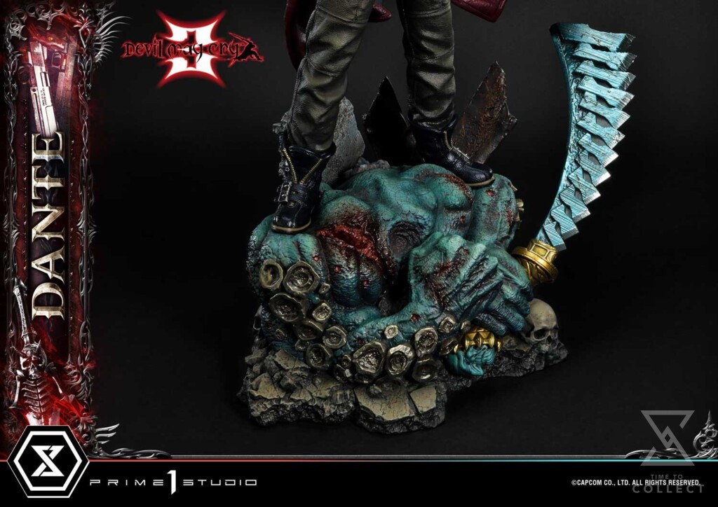 Prime 1 Studio is very proud to present yet another masterful entry to the Ultimate Premium Masterline Series: the 1:4 Scale UPMDMC3-01 Dante from Devil May Cry 3: Dante’s Awakening. Following Devil May Cry 5’s critical success, it comes as no surprise that Prime 1 Studio would keep on delivering fans another massive favorite. Let us take you on a stroll down memory lane, introducing Dante in all his glory from the series’ third title from the nostalgic era of the PlayStation 2. Prime 1 Studio’s artists have once again done a marvelous job at bringing life to the Nephilim in stylish and rebellious aesthetics that we’ve all known so well for almost two decades. Standing proudly at 26 inches tall, Dante’s in his younger years, iconic long, untamed white hair cascading down his face and contrasting with his gleaming, piercing eyes. His face reflects a carefree and cocky expression, conveying his devil-may-care attitude! The young devil hunter shows us his muscular physique while dual-wielding pistols, Ebony and Ivory, ready to unleash a storm of bullets at a moment’s notice. Strapped to his back is his faithful weapon, the massive magical blade known as Rebellion. His deep crimson coat billows dramatically, adding a sense of flair to the statue, textured and shaded to perfection, each zip and stitch has been carved with the highest level of skill. At his feet lays bloodied remains of some poor demon who’s met its doom.