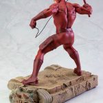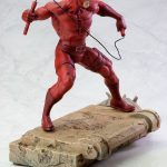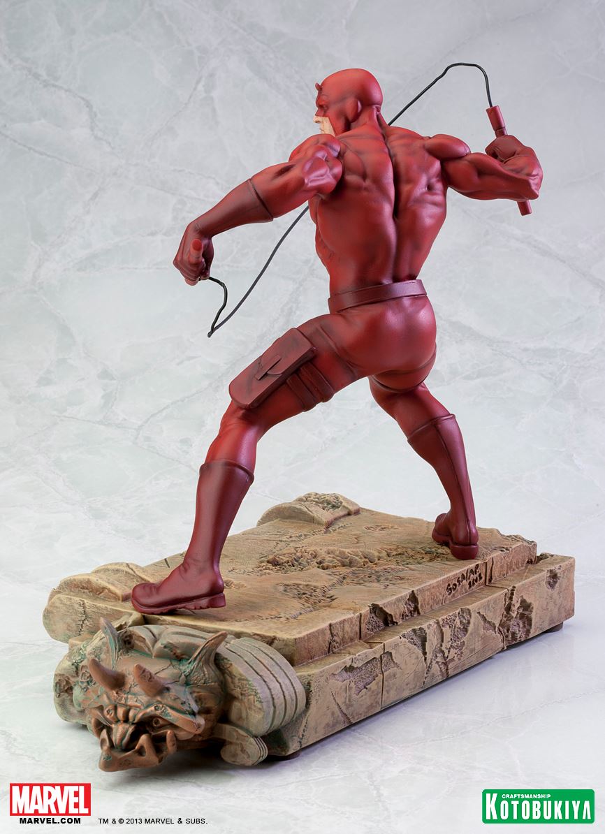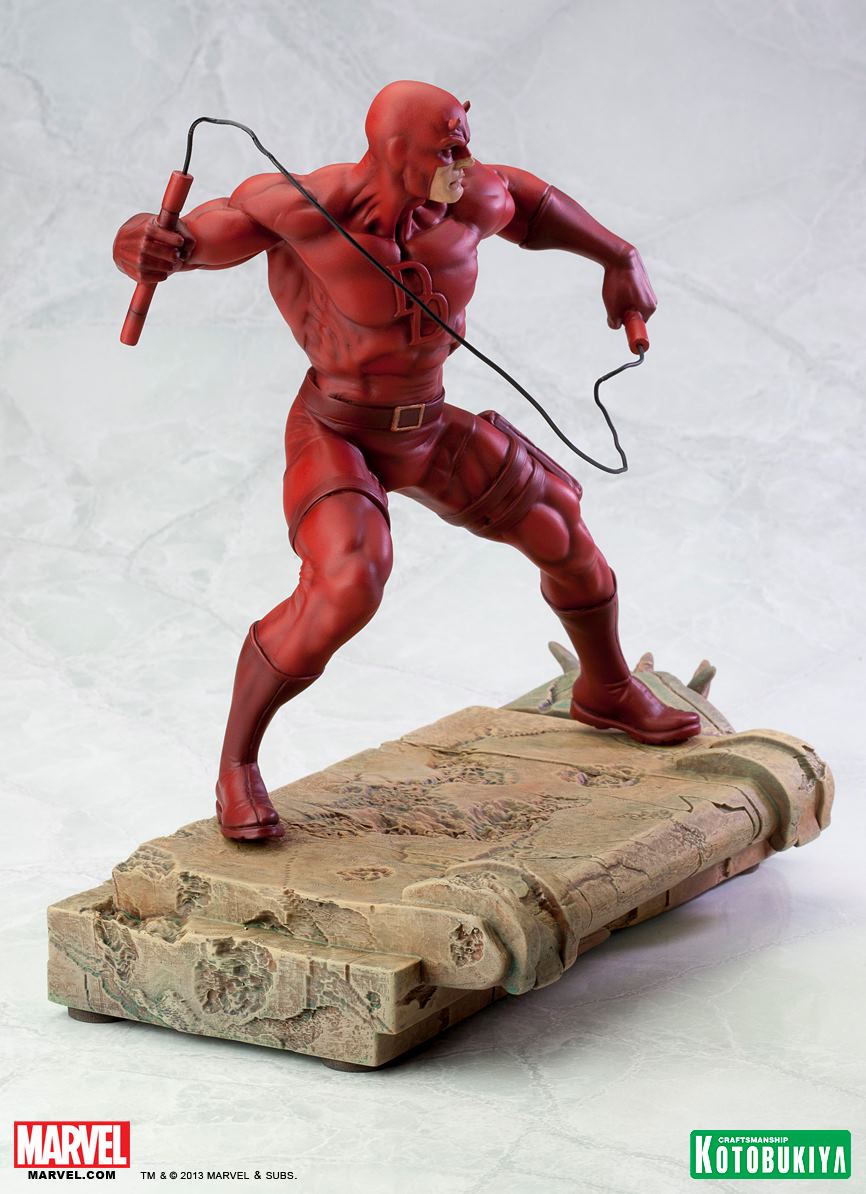 A Kotobukiya Japanese import. Kotobukiya turns to a defender of justice by day and by night. Daredevil stands on a cracked and broken rooftop, posing in a wide stance as he prepares to swing into the night with his club. The athletic hero has an incredibly detailed sculpt showing off every muscle and sinew, while his costume is perfect down to the last detail with its boots, gloves, belts and holsters and raised “DD” logo on his chest. Daredevil’s face captures Murdock’s intensity perfectly beneath the costume’s distinctive horns, his head cocked slightly as though he can hear crime even before it happens. In each outstretched hand the hero grips one end of his Billy club tightly, while a length of its retractable cord whips around him in a dynamic motion. Expertly sculpted by superstar artist Erick Sosa, Daredevil stands nearly 10 ½ Inch tall in magnificent 1/6 scale atop the gargoyle-accented Hell’s Kitchen rooftop. Display him alone or alongside other Marvel-inspired Fine Art Statues from Kotobukiya.