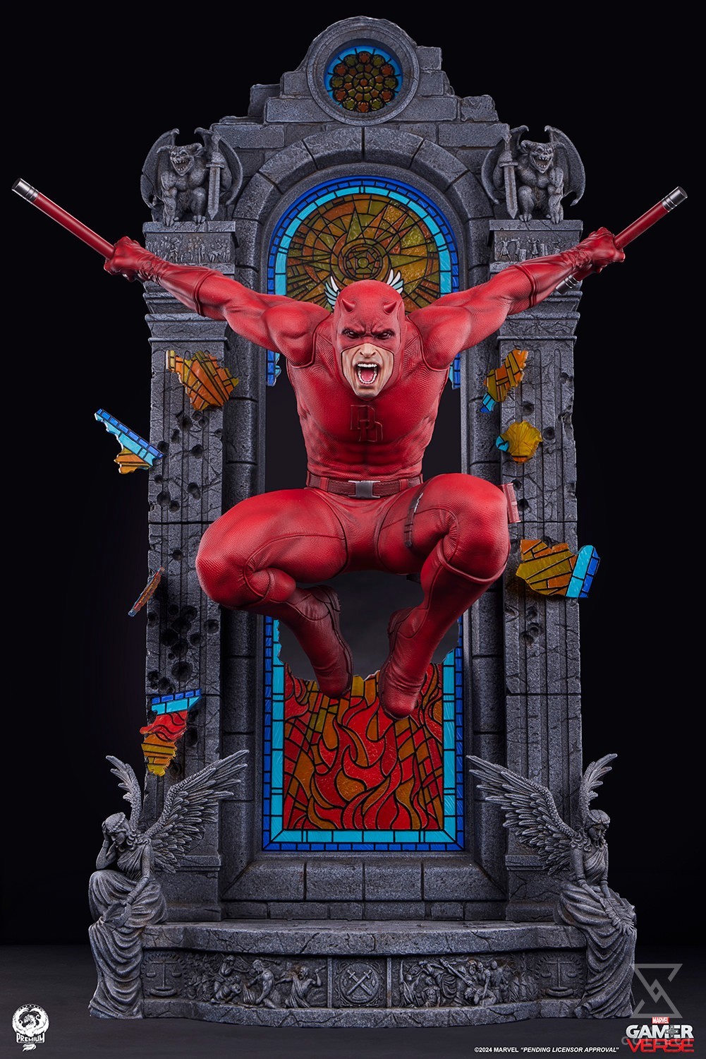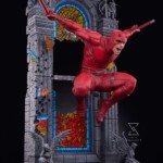 Standing at over 38” high, Daredevil is depicted bursting through a stained glass window, his knees tucked and arms spread wide in an iconic, dynamic pose. Clenched in each hand is a piece of his two-part billy club, his preferred tool for traversing the rooftops of Hell’s Kitchen. Every detail of Ol’ Hornheads costume has been recreated with expert care, from the seams on his red suit to the unique texture of his belt.