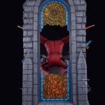 The base is a work of art unto itself. Framed by two stone columns topped with menacing gargoyles is the gothic arch housing the stained glass window our hero springs from. Fractured slivers of stained glass, possessing a lifelike translucency, appear to fly out from the broken window adding an uncanny level of movement to this statue.