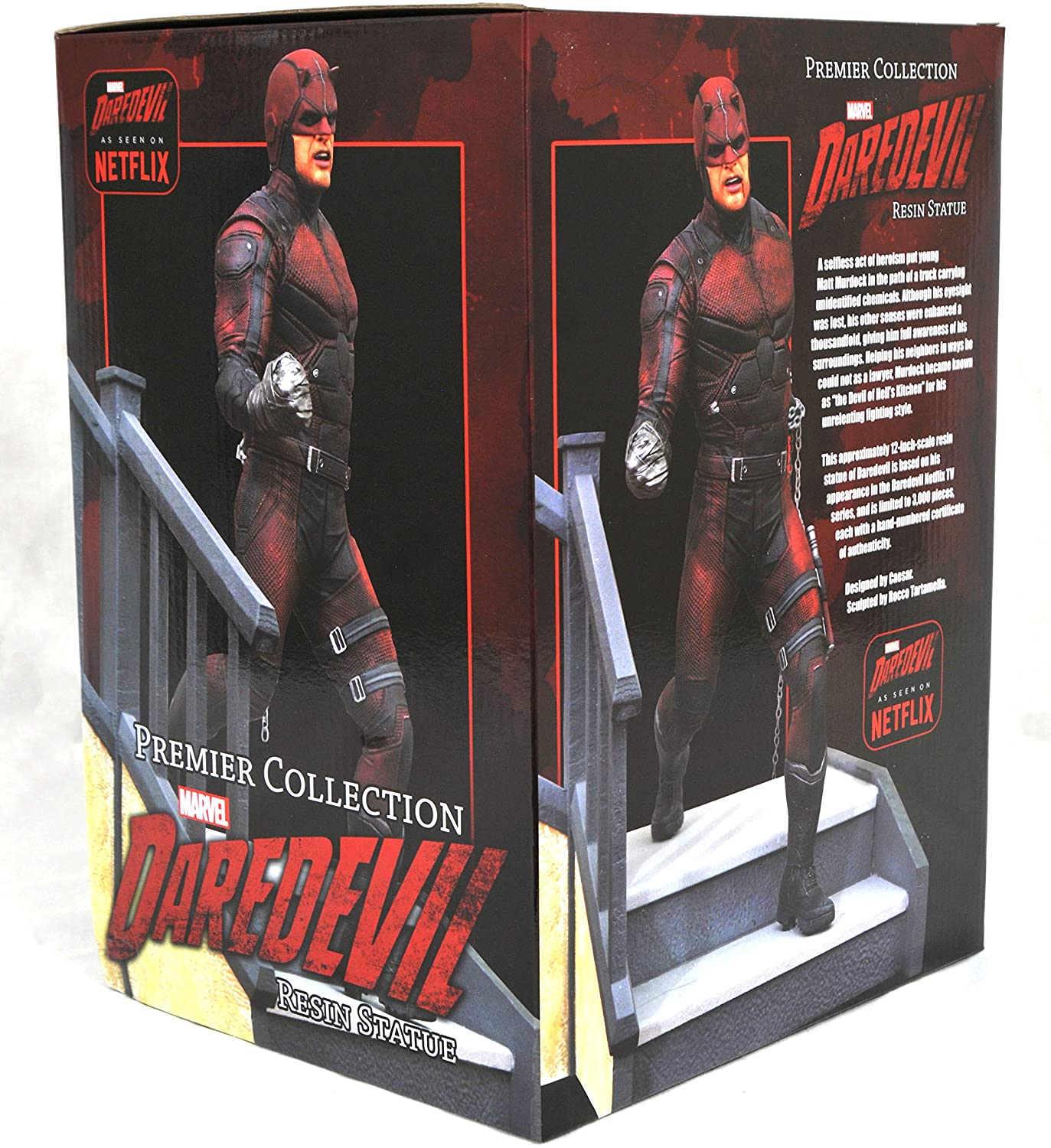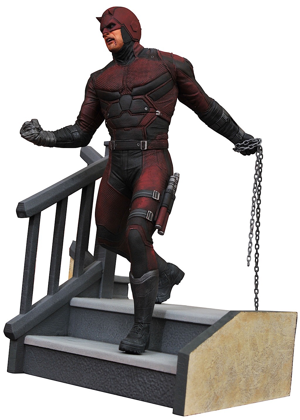 It’s a stairway to hell. Limited edition, 12-inch scale statue of Matt Murdock. Straight from the infamous fight scene in Marvel’s Daredevil Season 2 on Netflix, this superb 12-inch scale statue shows a battered Daredevil descending a staircase with duct tape on one hand and a chain in the other. The Marvel Premiere Netflix Daredevil Statue is a limited edition of 3,000 pieces that comes with a certificate of authenticity in a full-color box. It’s designed by Caesar and sculpted by Rocco Tartamella.
