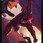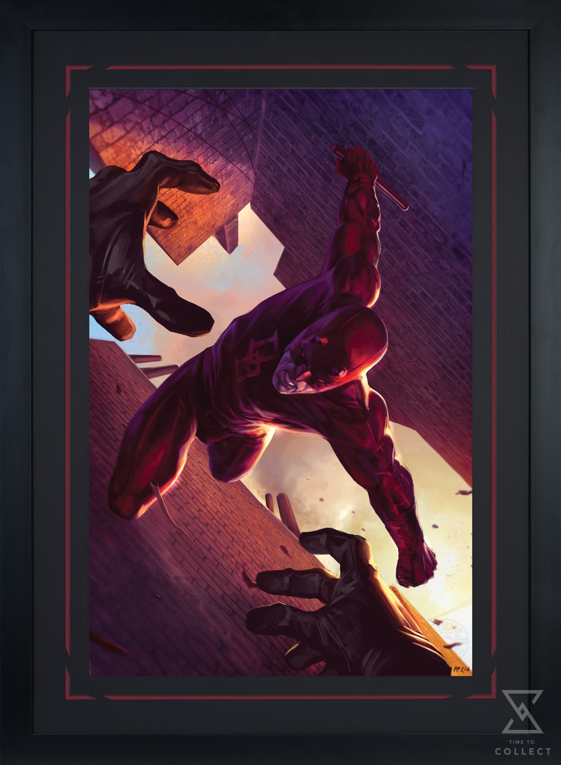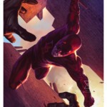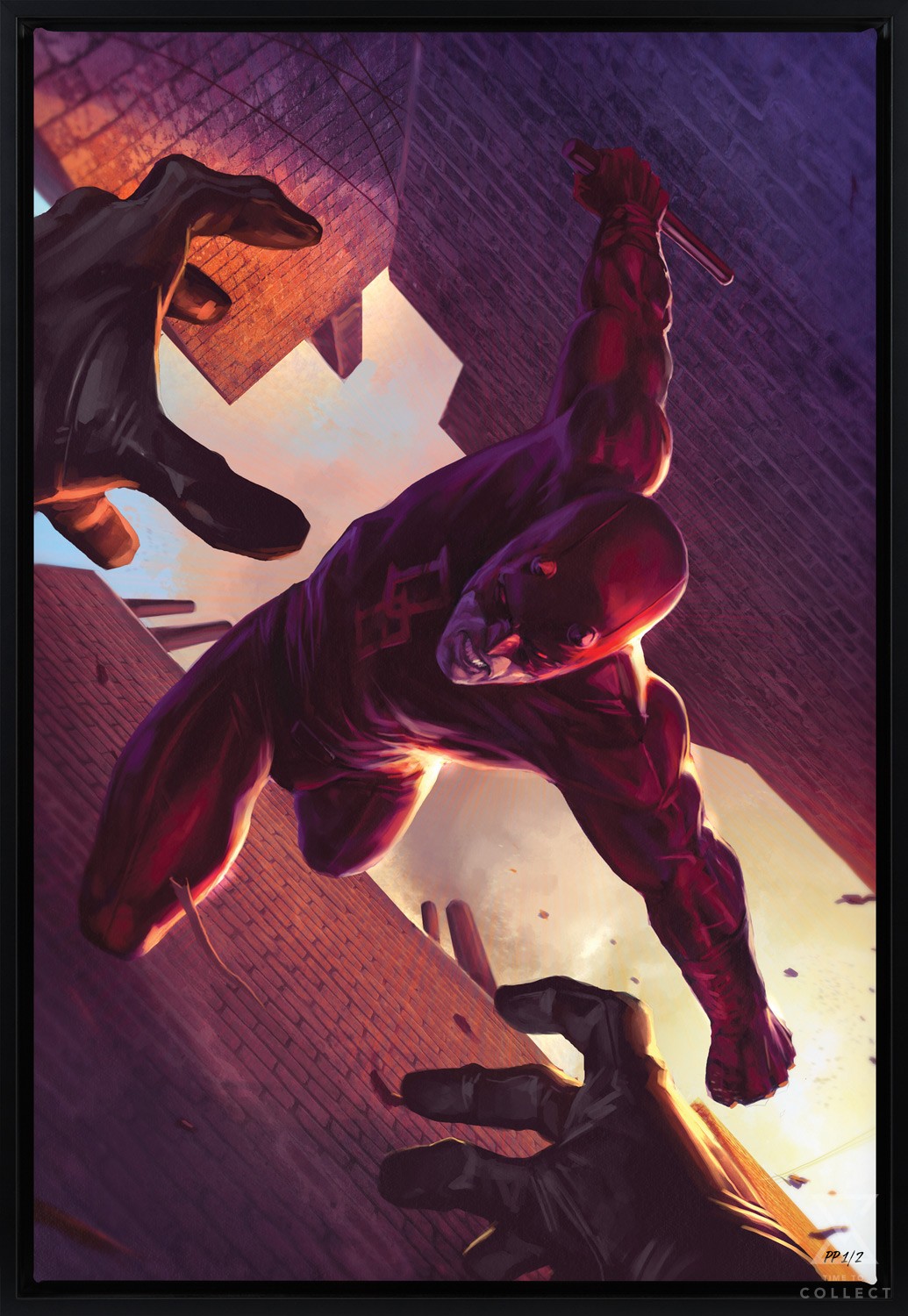 Red alert! Diving from a New York City rooftop, the masked super hero known as Daredevil uses his heightened senses to take the law into his own hands. The dauntless Devil of Hell’s Kitchen wields a billy club in his furious fist as he scales down bricks toward his foe. Conversely, the artist puts viewers in the perspective of the criminal, increasing our own awe and fear while Matt Murdock himself remains fearless. Two gloved hands stretch from the shadows — but they’re no match for this vigilante’s divine retribution.