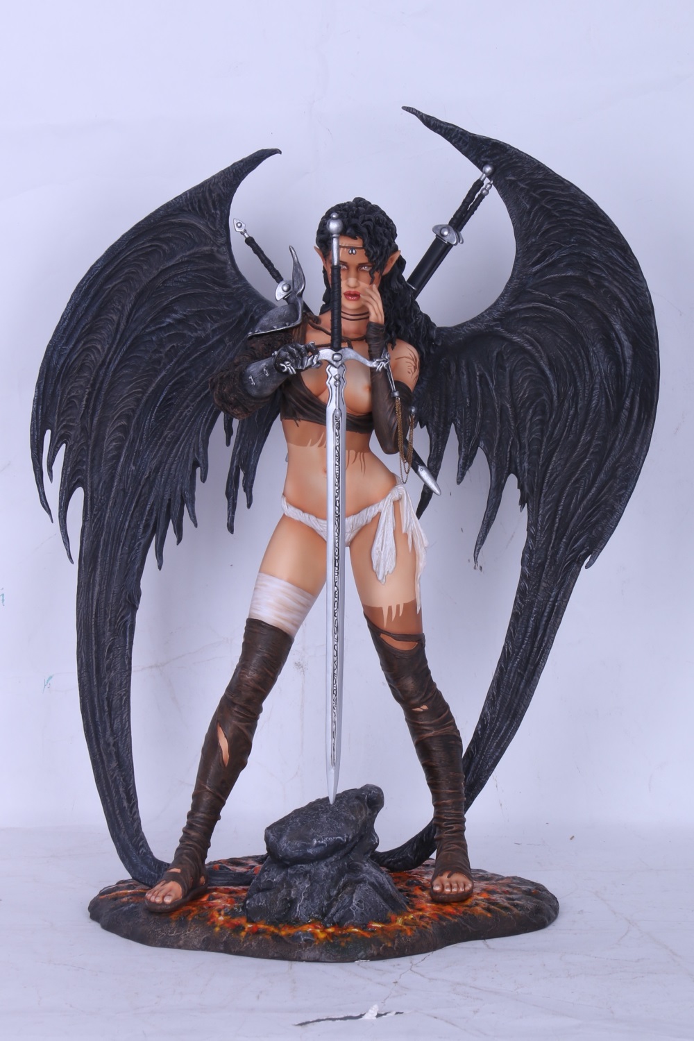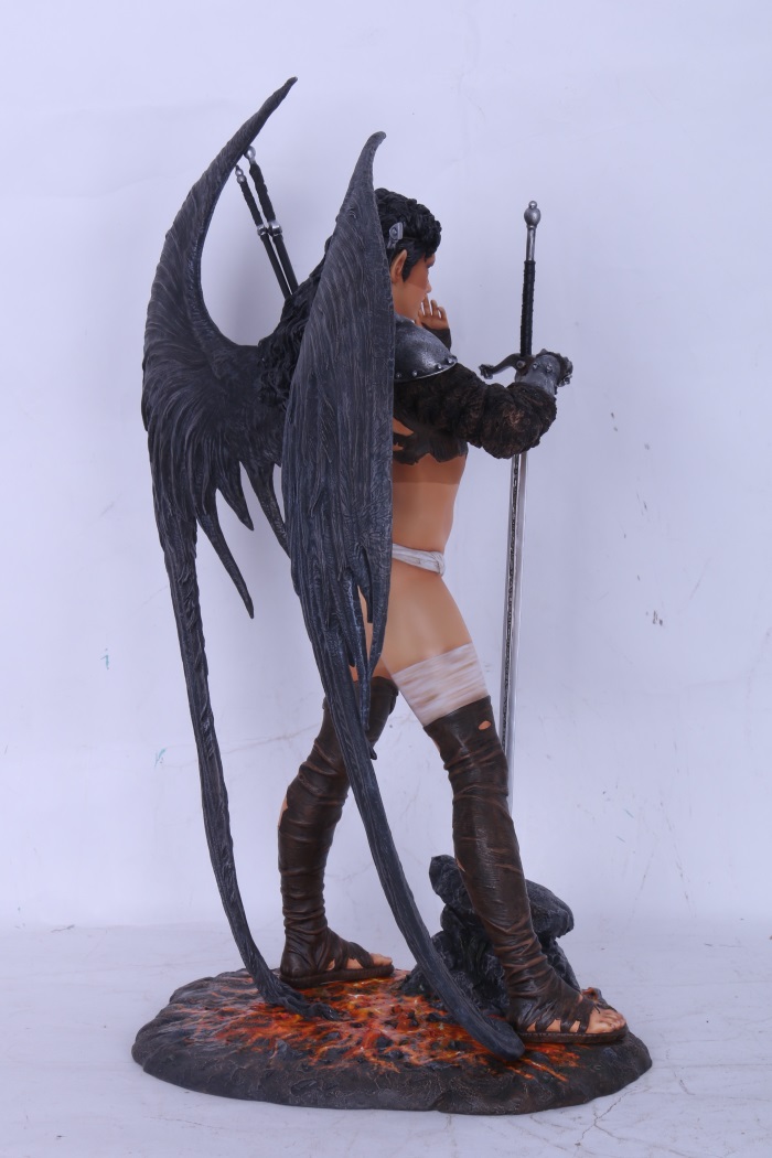 Lovingly caressed by the late fall moon that gently reflects upon the ebony feathers of her wings that tremble in agitation, she pauses; enshrouded in smoke and fog, one gauntleted hand resting heavily on the cross-guard of her sword, she gingerly and painfully touches her soft full lips from which blood runs freely from. With sharp pointed ears that twitch, she listens to the battle that rages around her. Despite being clad in the tattered remains of linen and leather and having one breast laid bare, her lithe and sensual body remains warmed by the heat of battle and feels neither the late autumn chill nor the damp kiss of the fog. No, the only kiss that she will feel this night will be that of her sword upon the humans that sought to enslave and attacked her tribe this eve… and what a terrible and dark kiss that will be!
