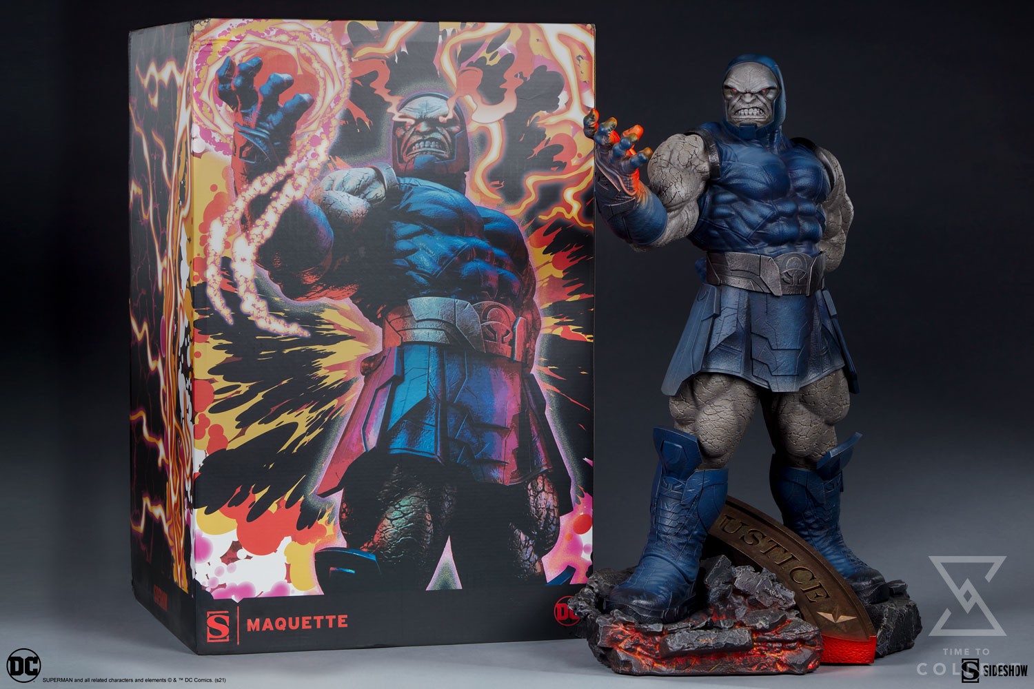 The Darkseid Maquette measures 24” tall atop the wreckage of a destroyed Hall of Justice base. The sadistic conqueror’s march through the Multiverse brings him to confront DC’s greatest heroes, the Justice League, as the rubble of their headquarters smolders and radiates from the heat of his Omega Effect abilities.