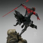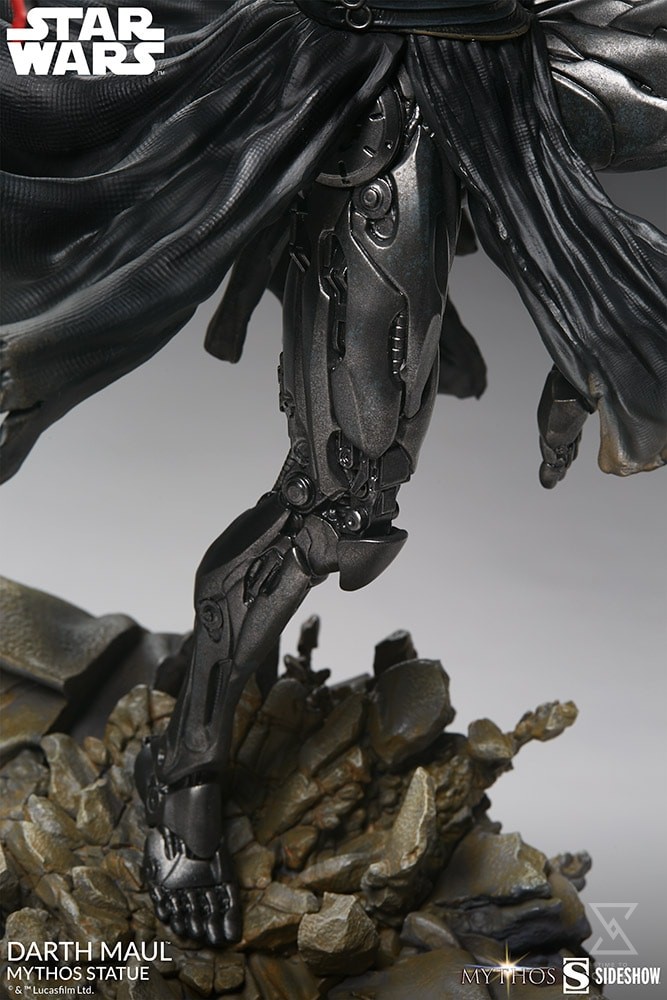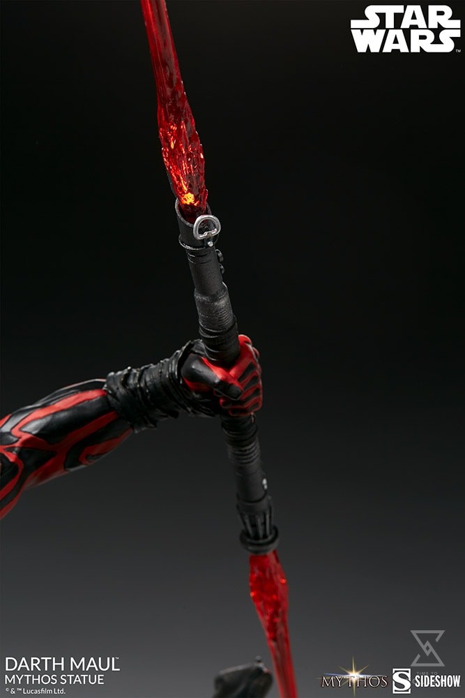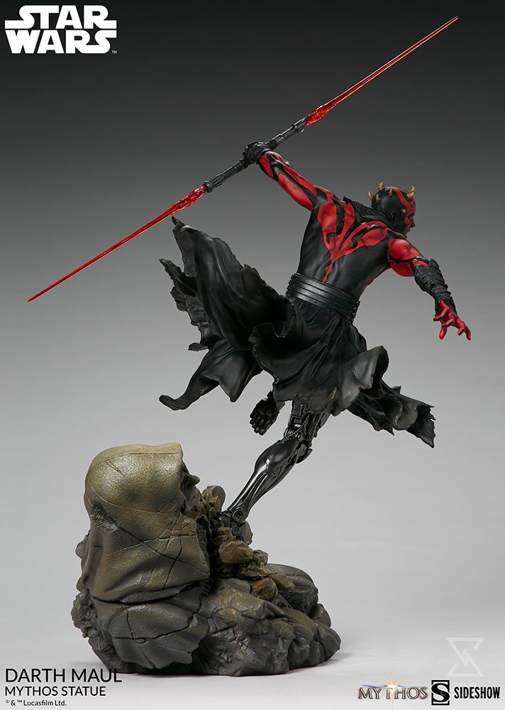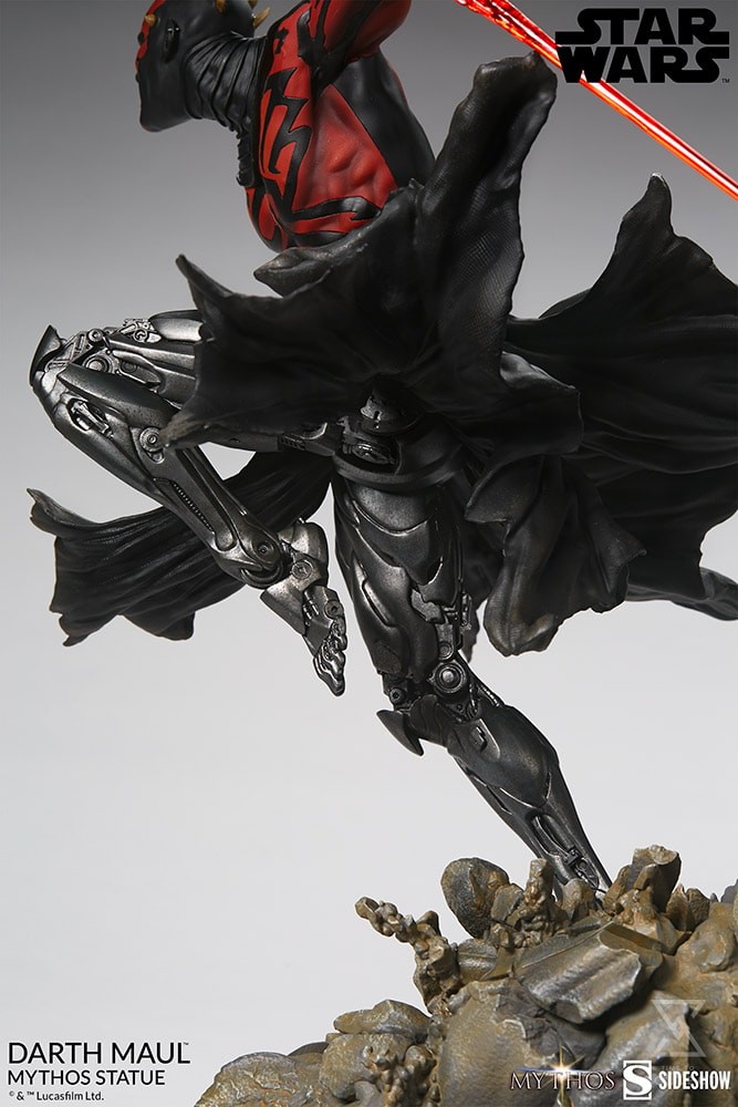 The Darth Maul Mythos Statue measures 23.5″ tall, as the hateful Zabrak warrior leaps from the crumbling ruins of a Sith temple monument, wielding his famed dual-bladed red lightsaber. In a savage rage, Maul prepares to enact his revenge on the accursed Jedi Order, the ones who took his legs and left him near death.