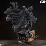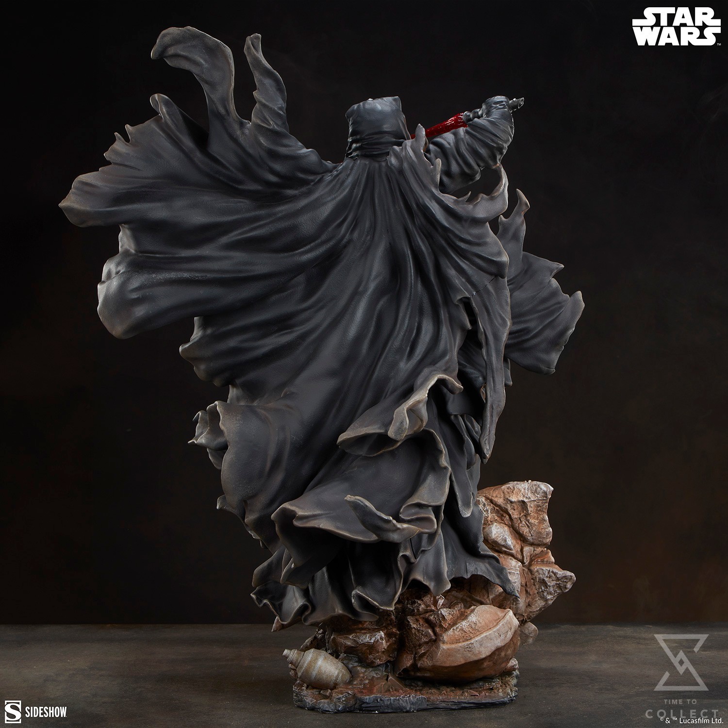 Measuring 21.46 inches (54.5 cm) tall, 16.9 inches (42.3 cm) wide, and 16.9 inches (42.3 cm) deep, the Darth Nihilus™ Statue is the grotesque embodiment of insatiable emptiness. With his dark cloak consuming all the space around him, Darth Nihilus leaps from a fragmented tomb surrounded by barren desert landscape. The weathered red rocks turn to the rusty color of dried blood when struck by this vicious villain’s Lightsaber™. He drains Force energy from every creature on his quest to preserve his own life, turning his heart as black as the robes he wears.