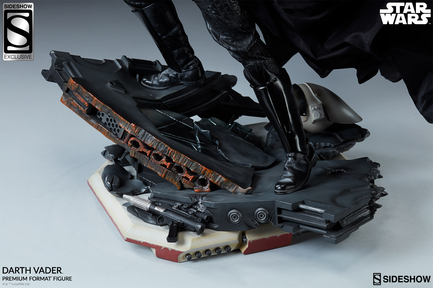 The Darth Vader Premium Format™ Figure measures just over 25” tall, as the Sith lord stands among the remains of a Rebel command ship base. Torn apart by his fury and lightsaber, the exposed mechanical insides of the ship still smolder with painted details of heated metal and shattered flooring.
