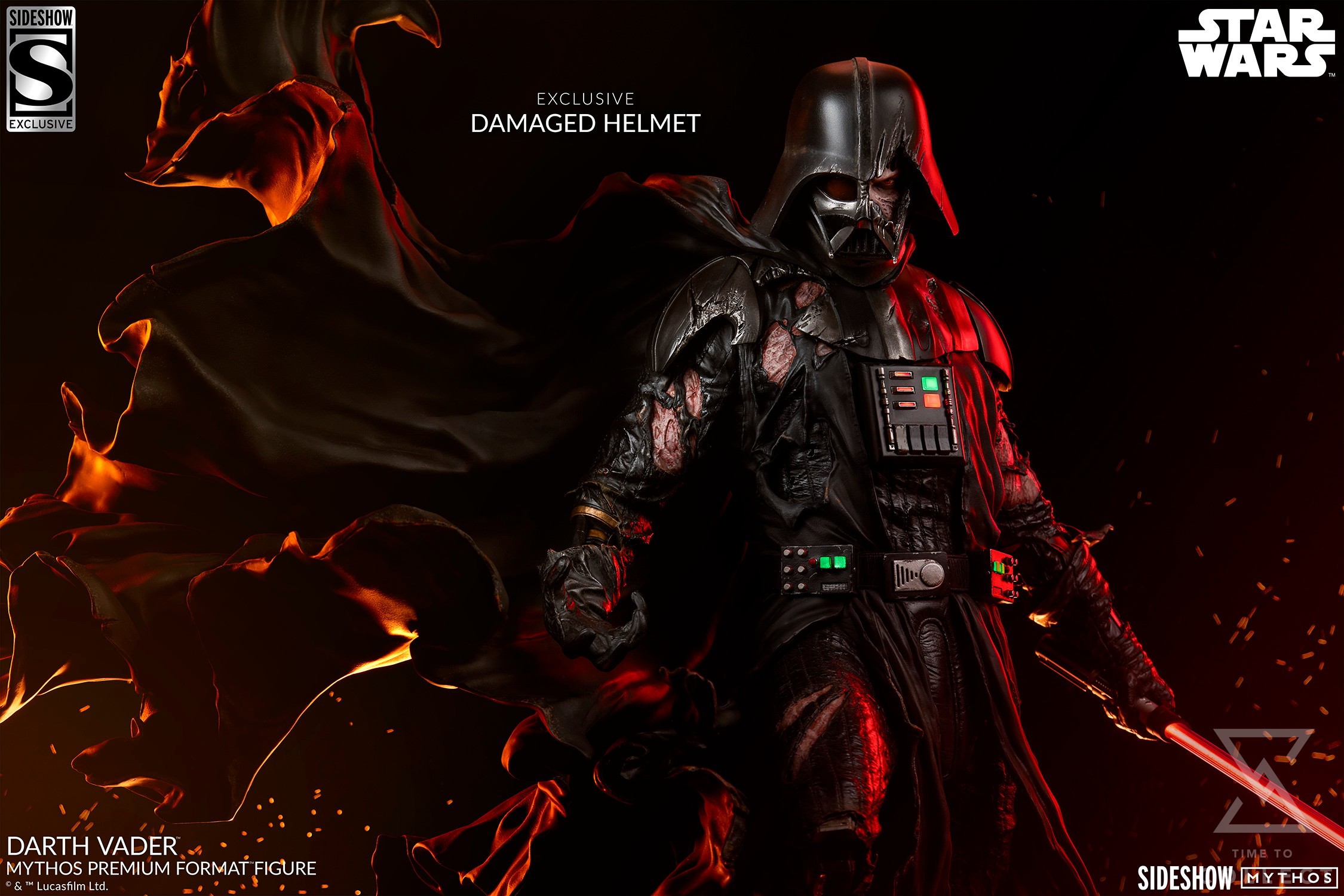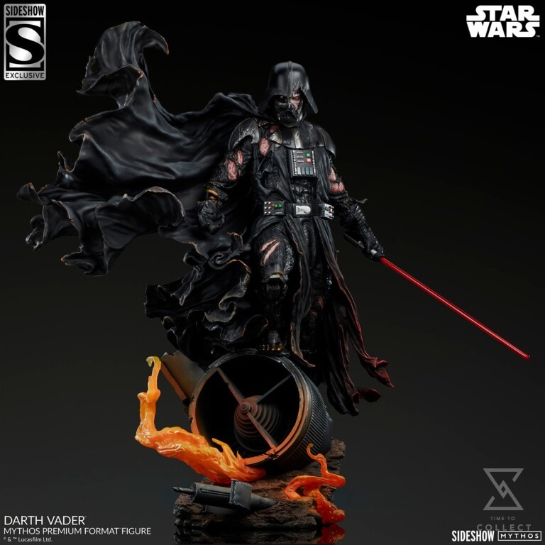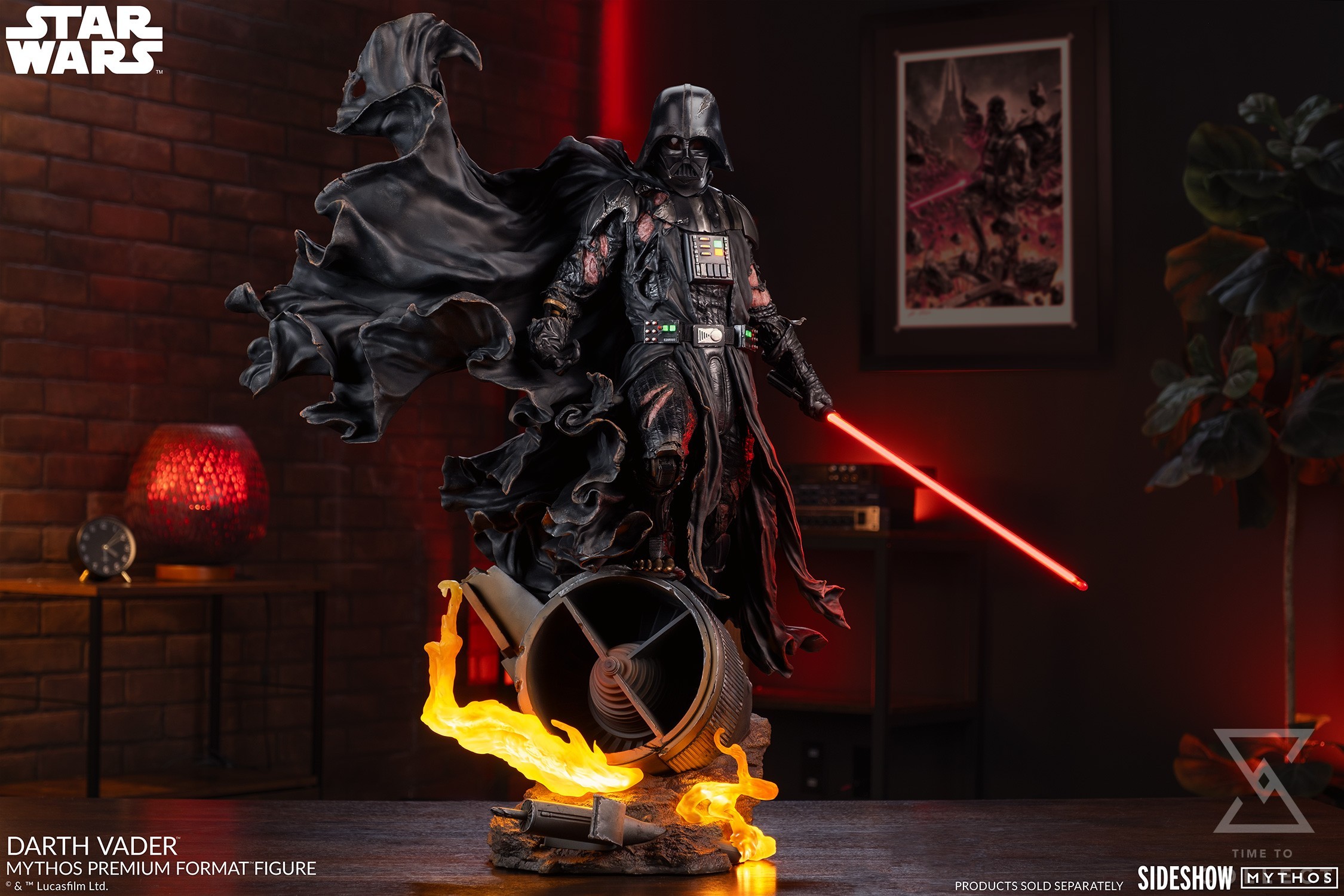Measuring 30” tall, 28.5” wide, and 15” deep, the Darth Vader™ Mythos Premium Format Figure depicts Vader standing atop the flaming wreckage of a Rebel X-Wing engine. The menacing Sith Lord is battle-worn but not backing down until he claims victory for the Galactic Empire. With lightsaber drawn and his armor in disarray, the dreaded villain shrugs off enemy fire while channeling his fearsome Force powers.