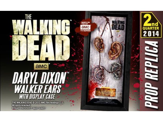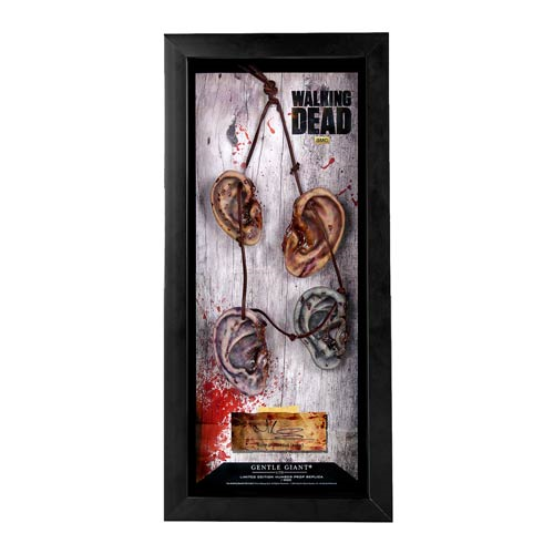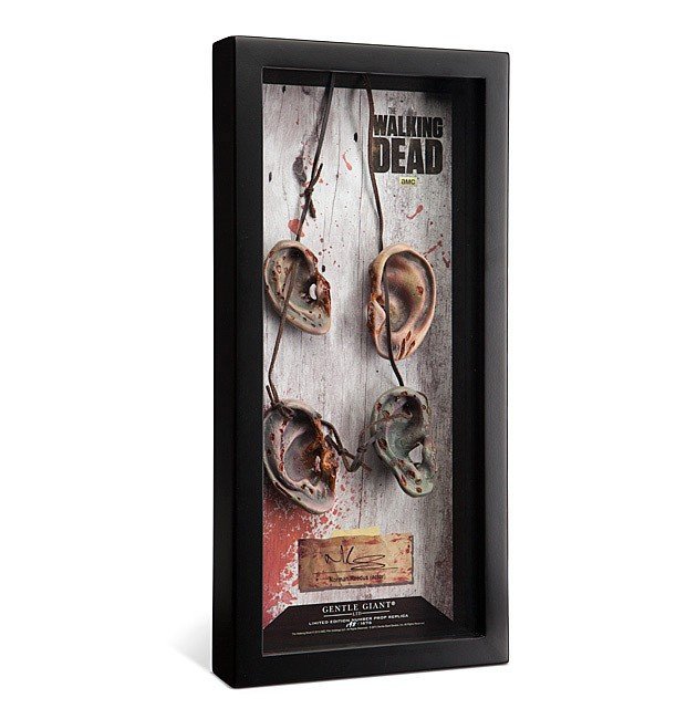 We’re all ears! Digitally sculpted using the actual prop necklace as reference and hand crafted by the master artisans at Gentle Giant Ltd., it’s The Walking Dead Daryl Dixon Walker Ear Necklace Prop Replica with Display Case! Just the thing to display with your crossbow and winged biker vest, the morbid neckware comes mounted in a beautiful shadowbox that also boasts an authentic recreation of actor Norman Reedus’ signature. This disturbing display piece is perfect for any hardcore horror fan’s collection! Limited edition of 1,676 pieces, Box measures 15-inches tall x 7-inches wide x 1 3/4-inches long.
