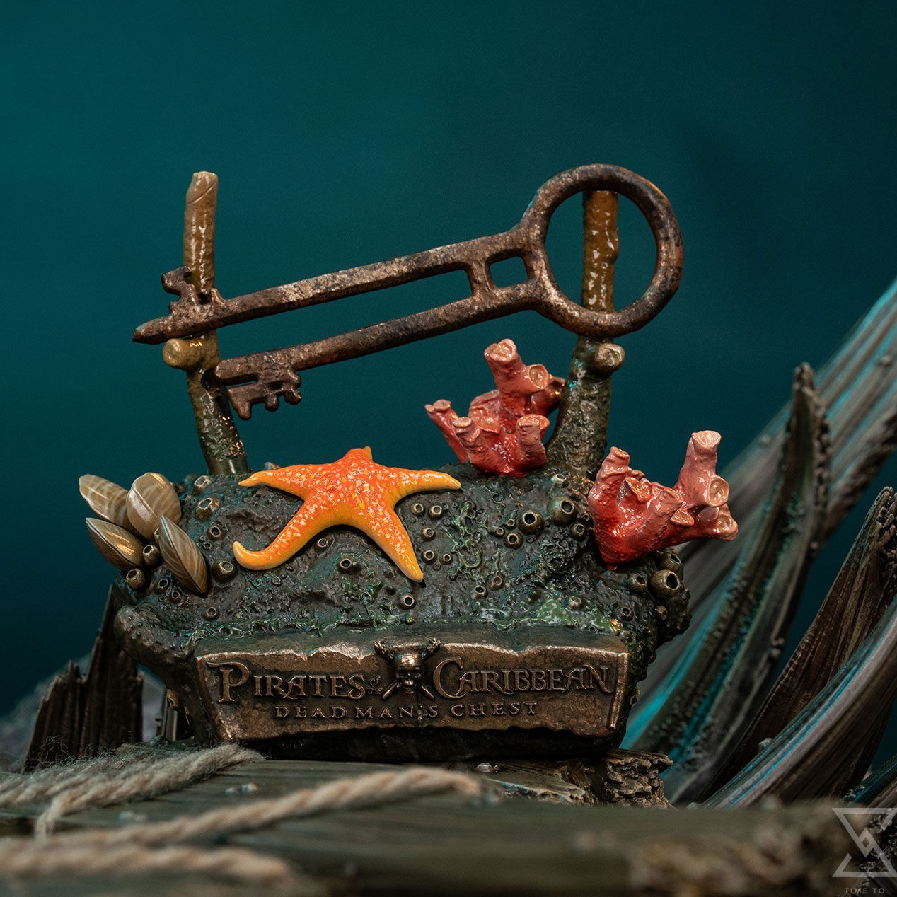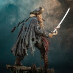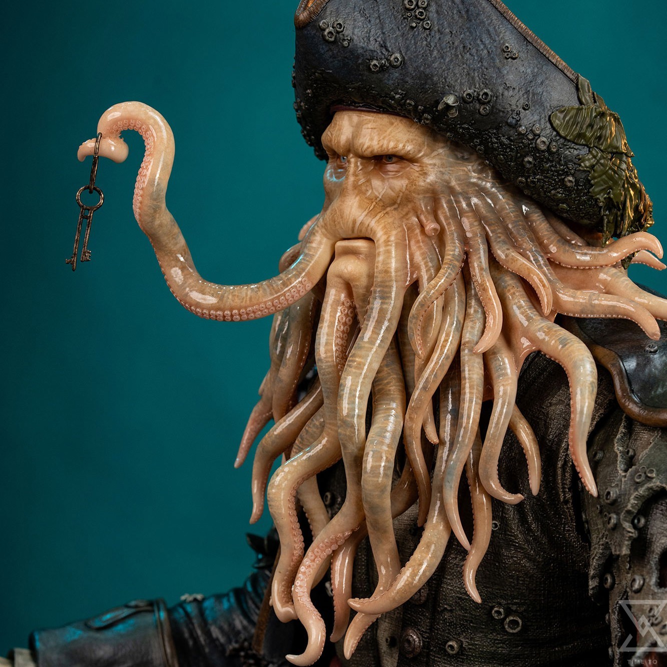 Davy Jones’ fantastic appearance is anchored by his incredibly detailed portrait. A massive beard of octopus arms hangs across his chest, with a cephalopod’s mantle peeking out from beneath the rear of his hat. Despite these exaggerated features, the intensely human look in his eyes allows a small peek into the personality that’s made him such an enduring fan favorite. The Deluxe Edition includes a second portrait where Davy Jones has traded his pipe for the key to the Dead Man’s Chest. This edition also includes a small branded display stand with a replica of the sought after key.