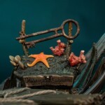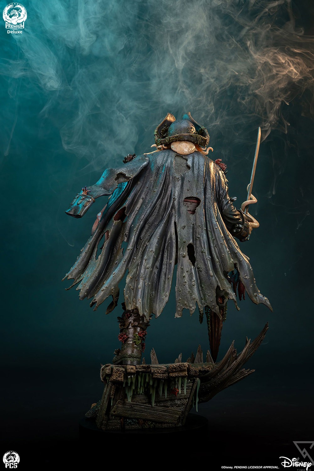 Standing nearly 30” tall, this seafaring swashbuckler is packed with incredible details. What remains of his clothing is tattered, salt stained and covered in barnacles. Deep green strands of seaweed hang from his hat and trousers; his right trouser leg giving way completely below the knee exposing the crab leg that’s taken the place of his right foot. Similarly, the left sleeve of his jacket has eroded away revealing a massive crab claw, Jones’ own take on a pirate’s hook.