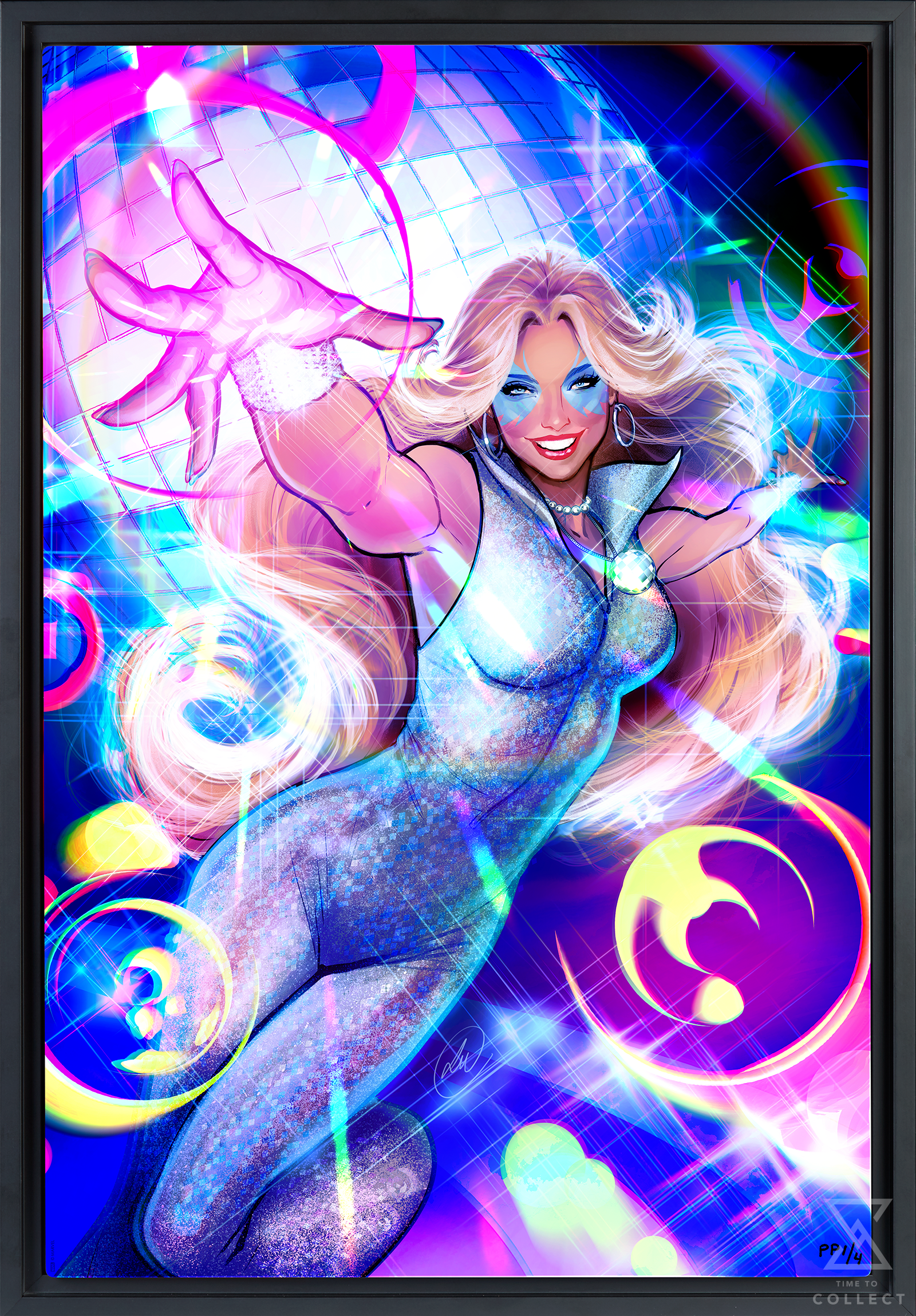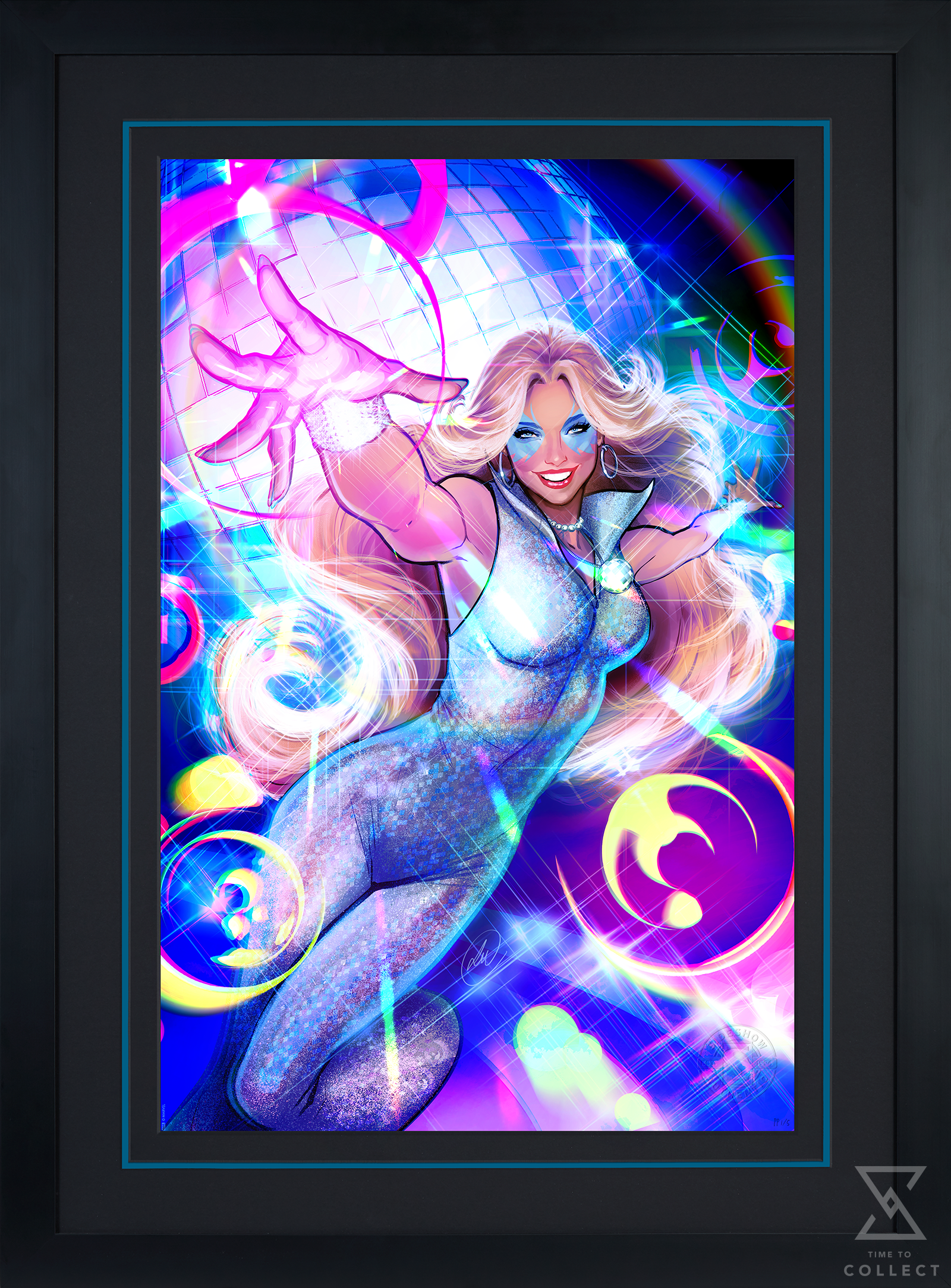 Strap on your skates and get ready to hit the dance floor with Dazzler! Stunning audiences with her mutant ability to convert sound into light, Alison Blaire lives life as a total disco queen. This vibrant and energetic illustration showcases her super specialty as brilliant bursts of color radiate from her performance. Behind her, a shimmering disco ball reflects rainbow hues in a totally psychedelic scene that’s sure to brighten your day.