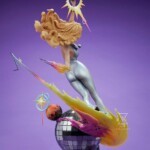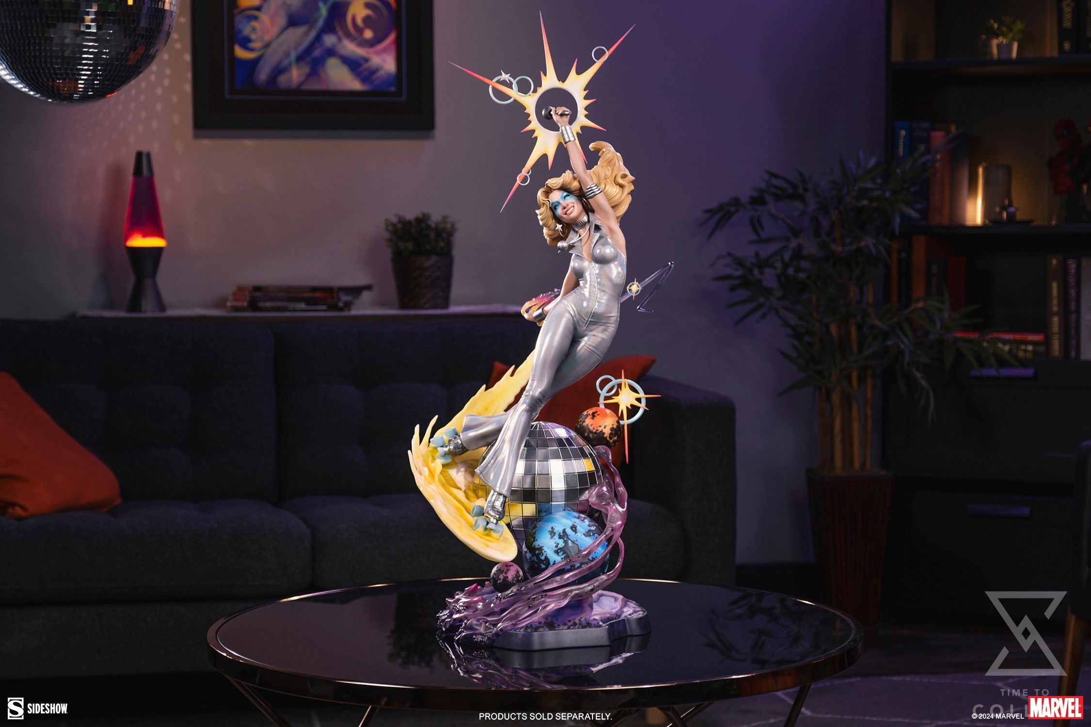 The Dazzler Premium Format Figure measures 31.25” tall, 13.4” wide, and 16.15” deep as Alison Blaire elevates her musical performance with mutant abilities that allow her to convert sound into light. Stunning in psychedelic silver, Dazzler livens up the dance floor by using her powers to create a trail of cosmic color beneath her rockin’ roller skates. She holds a hand mic above her like a beacon, its golden rays beaming almost as brightly as her feathery blonde hair and sparkling smile. Groovy!