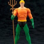 A KOTOBUKIYA Japanese import! Kotobukiya’s groundbreaking DC Comics Classic Costume ARTFX+ Statue series brings you brand new non-articulated comic book characters based on vintage 1980’s Super Powers action figure sculpts enlarged to 1/10th scale. Joining previously released Superman, Green Lantern, Flash, Batman, and Robin is the king of the seven seas: AQUAMAN! Retro is in and you can celebrate the great action figures of yesteryear with this vintage-inspired half-human/half-Atlantean Justice Leaguer resembling a classic five points-of-articulation toy. An all new sculpt updates the classic style yet retains the nostalgic feel, and collectors will immediately recognize the inspiration for this look. Aquaman surveys the world above and below the waves for trouble, and his iconic costume is in full effect with its scalloped orange shirt, green gloves and lower-body suit (with fins), black trunks, and yellow belt. The blonde amphibious hero smiles confidently, and you can display him with his trademark golden trident in either of two poses!