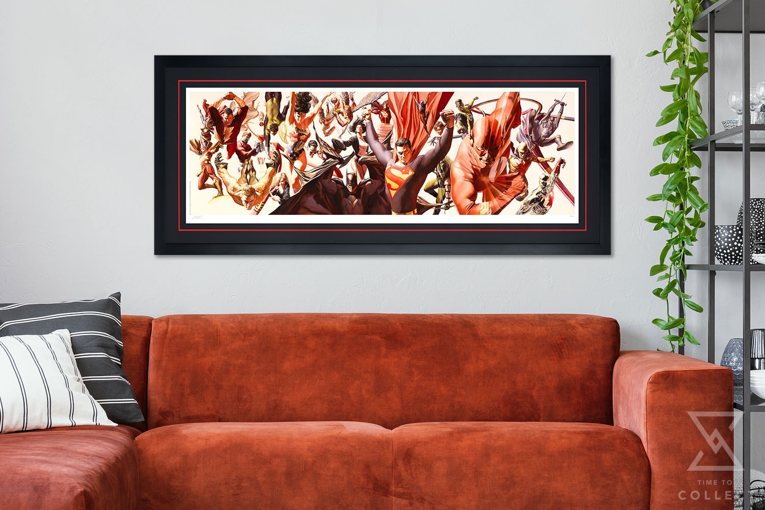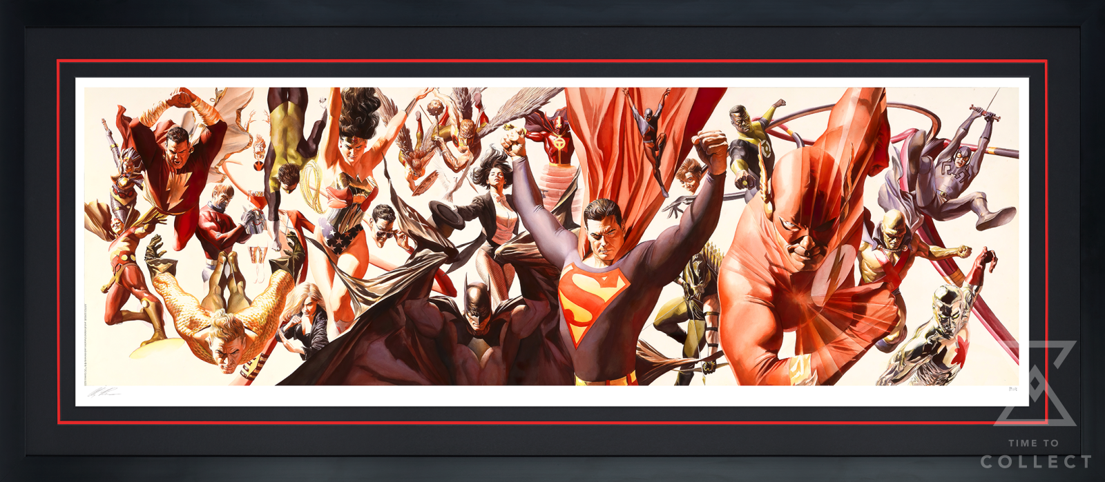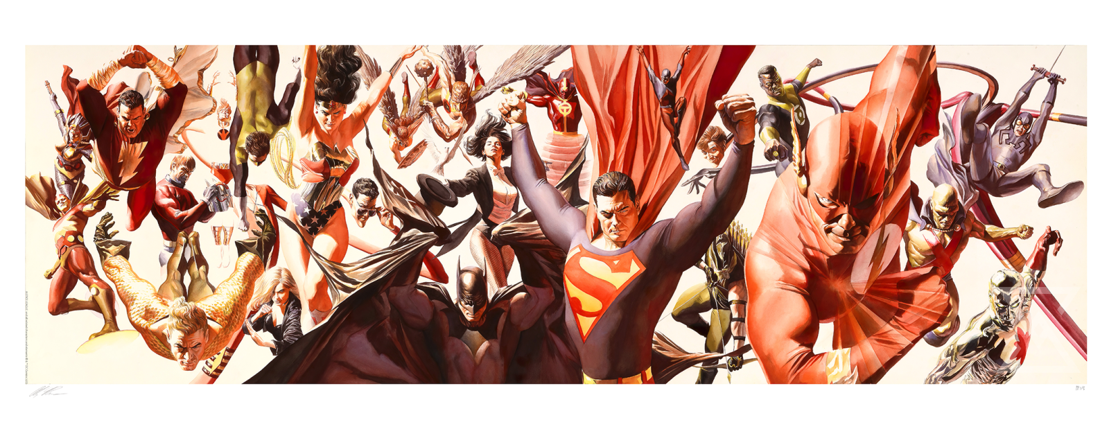 When someone needs saving, the World’s Greatest Super Heroes are ready to unleash justice! From the beloved Trinity of Batman, Superman, and Wonder Woman to the brave and bold champions like The Flash, Zatanna, Green Arrow, and Green Lantern, this energetic composition features 24 fan-favorite faces in all. The print is rendered in Ross’ distinct perspective and photorealistic style as these Justice League members and allies use every ability at their disposal – like super speed, flight, magic, and technology – to mete out punishment against any villain standing in the way of good.