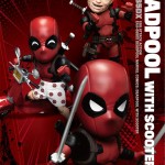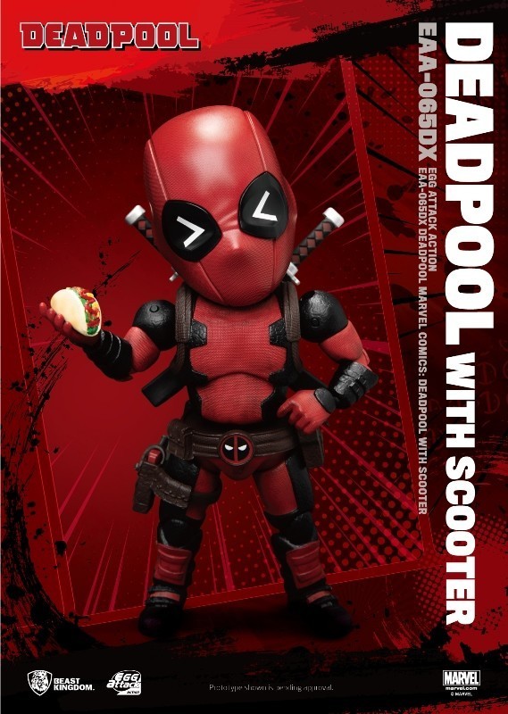 The most charming and humorous superhero is back with a new look and tons of accessories to boot! The ‘Anti-Hero’with a disfigured face, Deadpool is a one man army able to heal himself from nearly any kind of injury. Bestowed with superhuman abilities Wade Wilson AKA Deadpool is on a mission to break some regular bones, and funny bones as well! Beast Kingdom’s Entertainment Experience company is back once again with the latest signature Egg Attack Action series of Marvel Heroes action figures. This time with real fabrics used for the clothing. The classic red and black suite and leather like trousers are completely reproduced with accuracy. To really kick it back ‘The Merc With A Mouth’also gets to sport some snazzy Deadpool undies. A real head turner! With a host of new accessories, including replaceable eyes, Taco hands, weapons and a new Wade Wilson, unmasked head sculpt, collectors can enjoy posing Deadpool in many different styles. But wait, there is more, the coolest set piece to come out of Deadpool 2 was without a doubt the chase scene with the signature red scooter. This limited edition set also includes Deapools very own scooter with light up front and tail lights as well as design stickers, allowing collectors to recreate some zany actions scenes. So don’t miss your chance to add the latest Deadpool figure to your collection today!