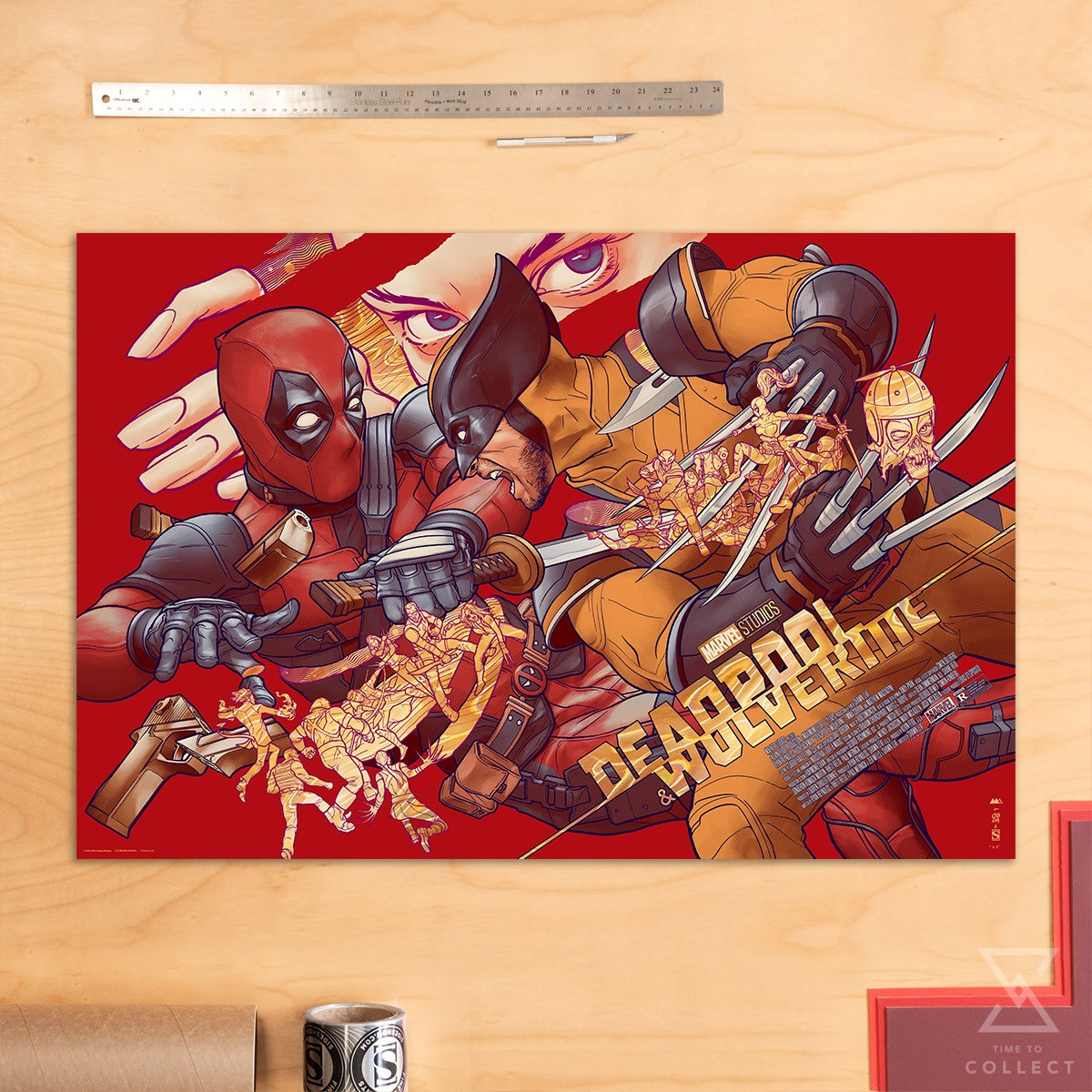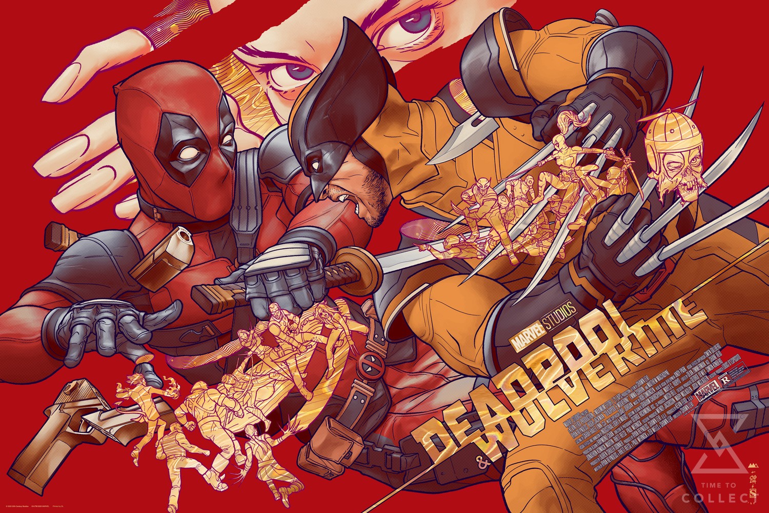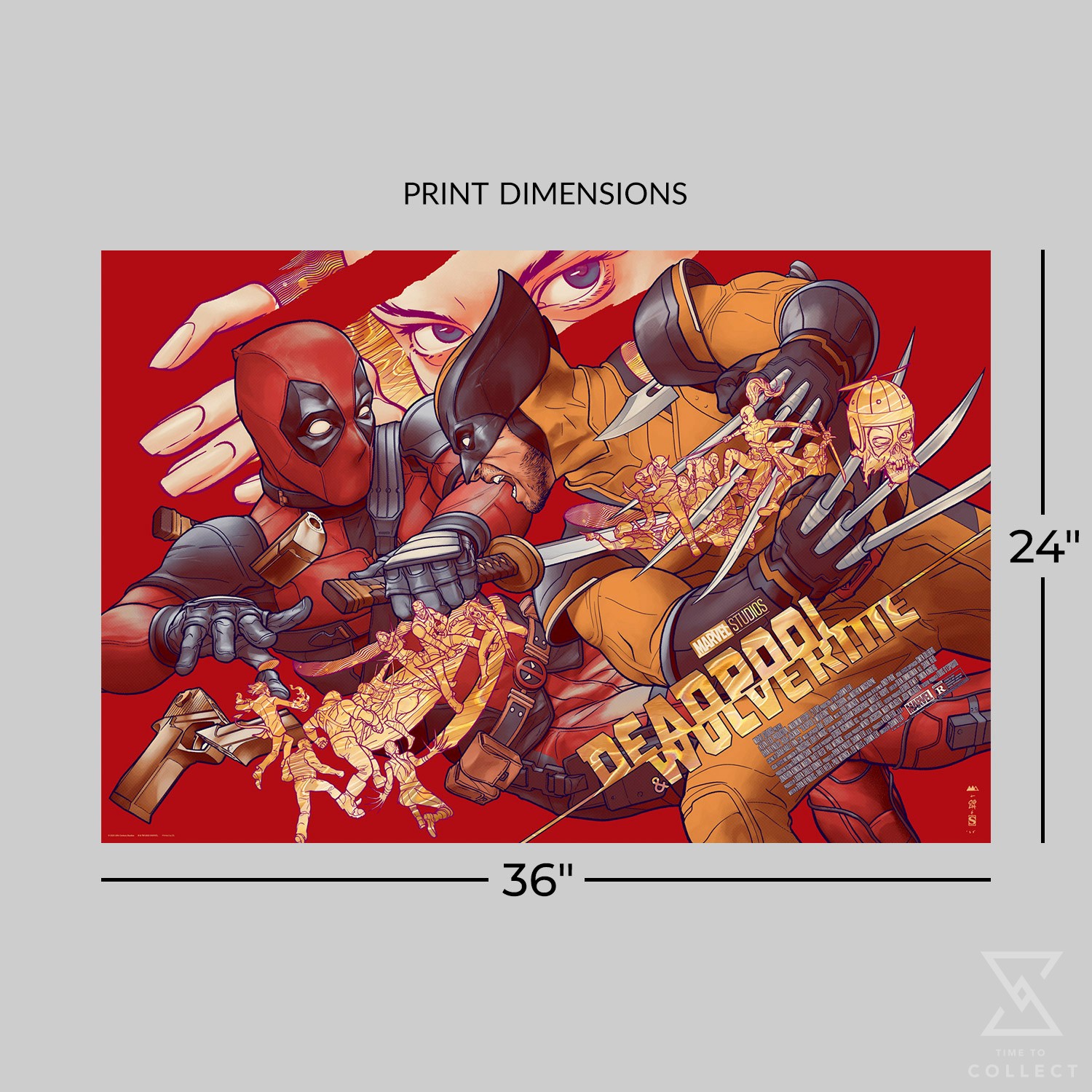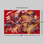 Inspired by Deadpool & Wolverine (2024), directed by Shawn Levy for Marvel Studios, this movie poster is available as an unframed, 11-color gold lava foil paper screenprint created by DL Screenprinting. Measuring 36” x 24”, it is the ideal display size for film fans and Marvel art collectors alike.