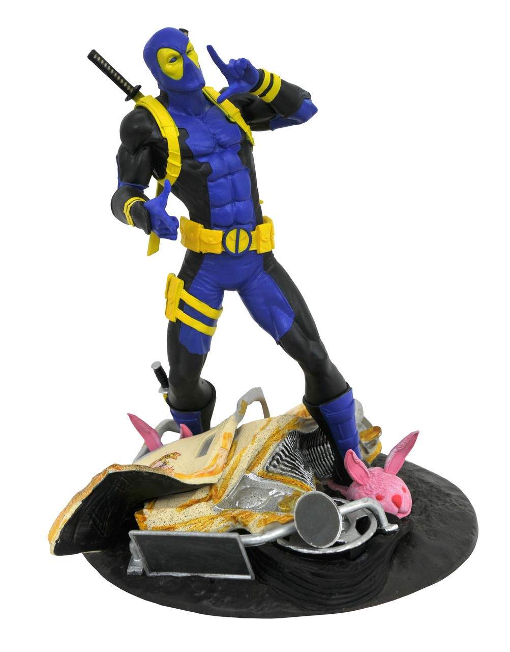 A Diamond Select Toys release! Deadpool returns to the Marvel Gallery line in style! Unfortunately, his ride got trashed along the way, and Deadpool is posed atop a destroyed taco truck base, sporting bunny slippers and wielding twin finger guns with the safeties off! This all-new sculpt spotlighting the softer side of Deadpool stands approximately 10 inches tall and is made of high-quality PVC with collectible-quality paint applications, and this con-exclusive variant depicts him in his blue-and-yellow X-Men colors! Sculpted by Cortes Studios!
