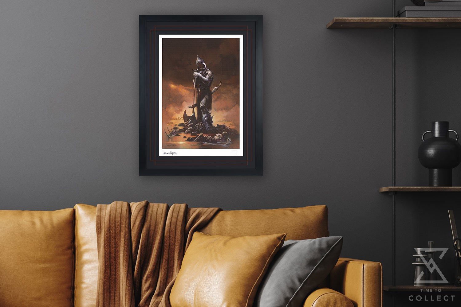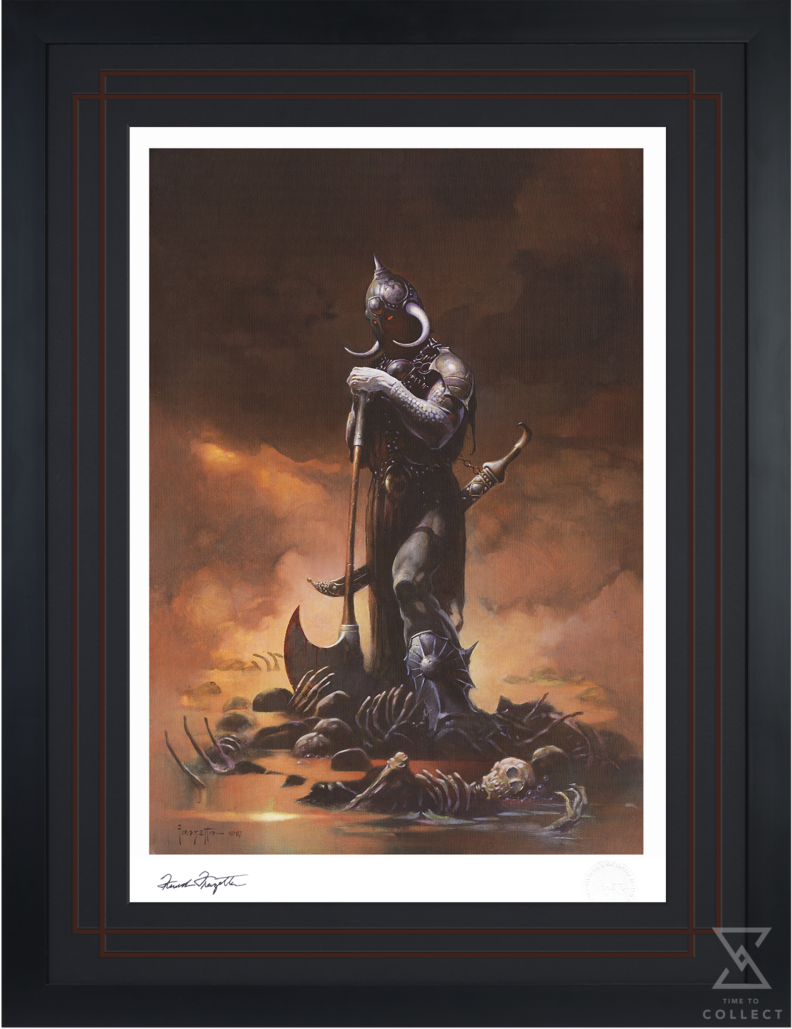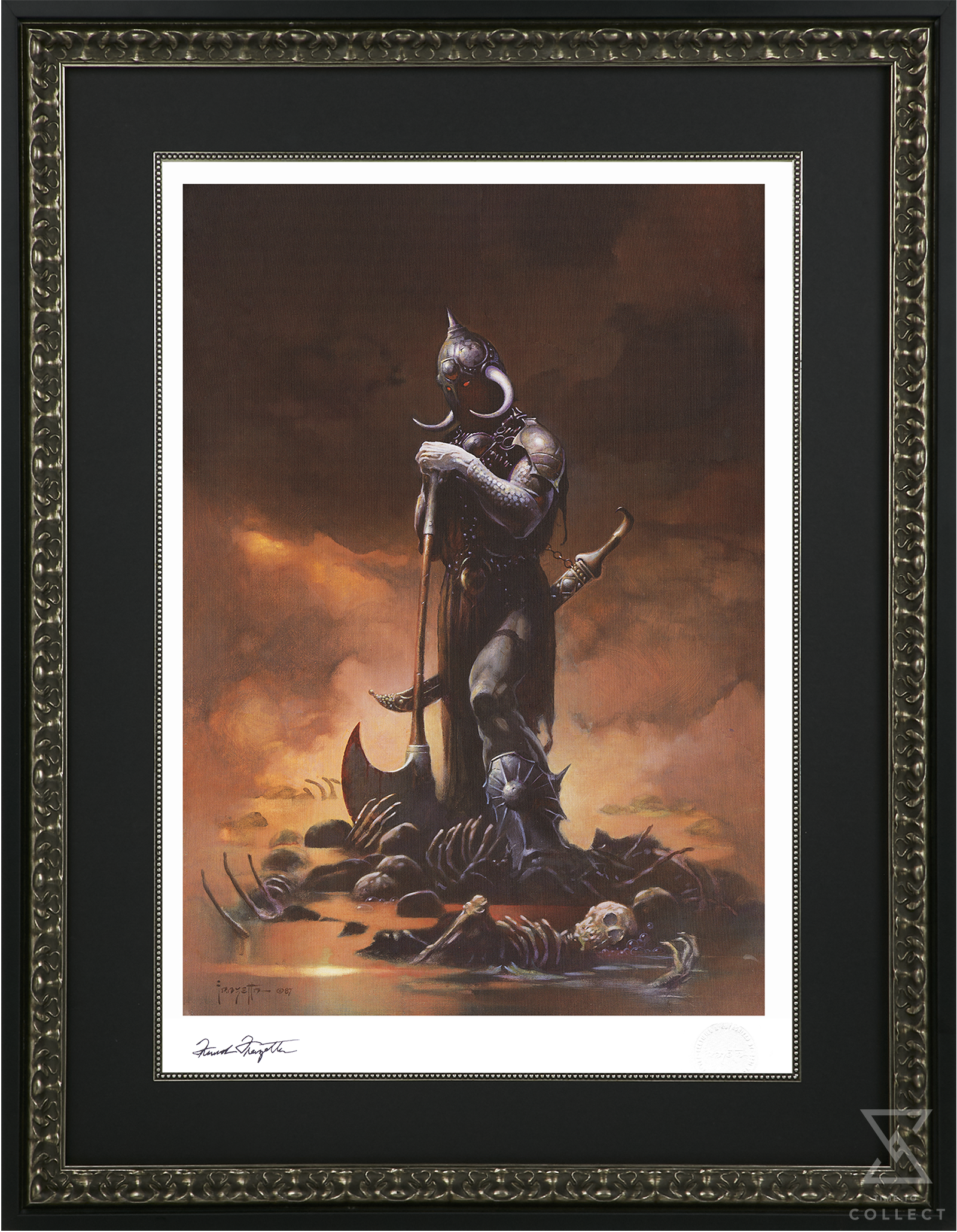 Faithfully recreating all the fearsome details of this famous image, each Death Dealer III (Original) Fine Art Print features a hand-stamped, authorized signature of artist Frank Frazetta as well as the official Frazetta Art Museum embossed Seal of Authenticity. Each piece in the limited edition of 300 will also include a Certificate of Authenticity, and a portion of the proceeds will directly benefit the Frazetta Art Museum’s preservation and exhibition of the artist’s famed original works. Available unframed and in a custom framed format, this terrifying fantasy wall art makes an exciting addition to any collector’s gallery.