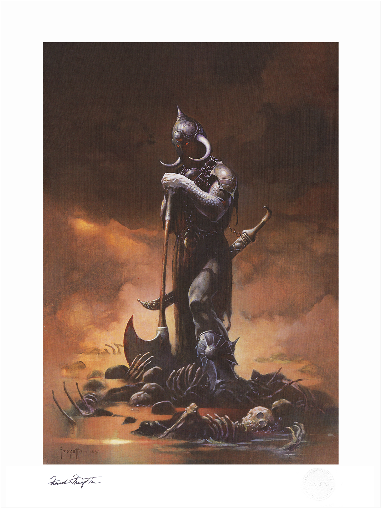SIDESHOW ART PRINTS AND THE FRANK FRAZETTA ART MUSEUM PRESENT THE DEATH DEALER III (ORIGINAL) FINE ART PRINT BY LEGENDARY FANTASY ARTIST FRANK FRAZETTA. THIS ESSENTIAL FANTASY ARTWORK IS ONE IN A SERIES OF ICONIC DESIGNS THE ARTIST CREATED OF THIS SIGNATURE CHARACTER.